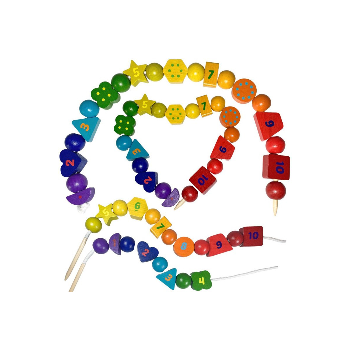 - TEACHING NUMBERS; COLORS AND SHAPES: A fun way to teach numbers, colors and shape while lacing and stringing with the wooden threadable beads!