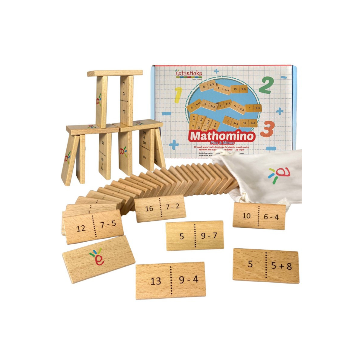 The math domino Plus & Minus is a fun game for learning arithmetic in the number range 20 recommend for 1st grade or from 6 years on. Many creations are possible with the dominoes, be it 2D or 3D. The Mathemino promotes learning with fun as a healthy entertainment at home or at school! The natural domino game is made of high-quality processed beechwood and a cotton bag to store all dominoes. The math game, like all our toys, exceeds the safety regulations according to DIN EN 71 & ASTM/CPSIA.