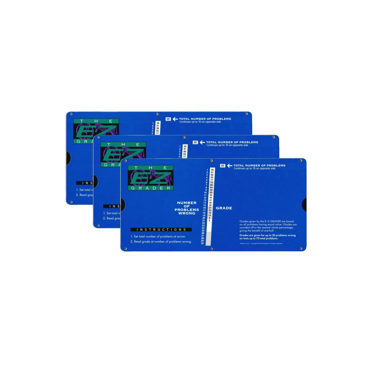 We are proud to introduce the latest addition to our line of quality slide charts for the educator, the Large Print Royal Blue E-Z Grader. Scores up to 70 problems with up to 30 problems wrong. Actual size is 10" x 5". Sold as a pack of 3.