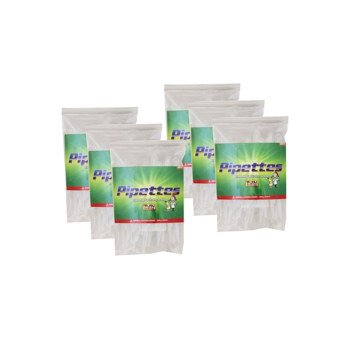 This valuable instrument is useful for transferring liquids, mixing color, art, and testing household solutions. Improve children's fine motor skills by allowing them to pinch and release liquids with these wonderful plastic pipettes. Mix colors and count the drops of water each student can place on a coin. Pinch and release, pinch and release! These pipettes make a great addition to the Science Accessories portion of your science center. Scientific Skills: Fine Motor Skills, Hand-Eye Coordination, Experimenting and Observing. Draws 2ml. Each pack includes 25 pipettes. Sold as 6 packs for a total of 150 pipettes.