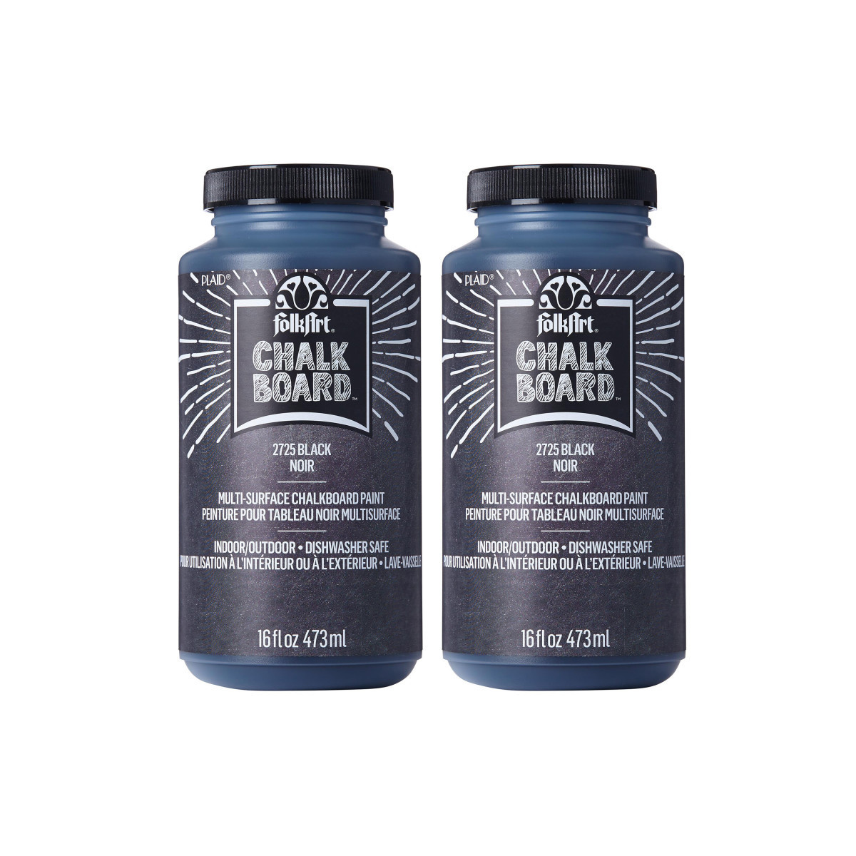 Now you can create a custom chalkboard surface on all your projects with the FolkArt Chalkboard Paint. This chalkboard paint is great for decorating furniture, home decor, gifts, and more. Use on a variety of surfaces such as wood, terra cotta, metal, and many other surfaces that need a personal touch. With this easy-to-use formula, simply brush on, let dry, and condition with chalk. Add the FolkArt Chalkboard Paint to your art supplies to give all your projects a touch of creativity. Sold as a pack of 2.