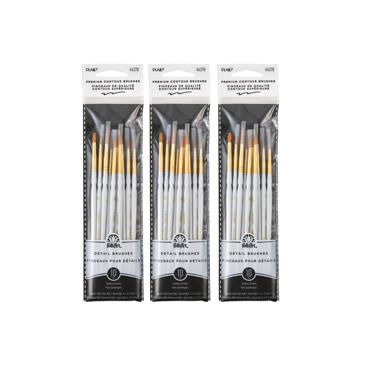 The Detail Brush Set from FolkArt has the perfect brush for your decorative painting or craft project. The premium synthetic bristles are designed to provide consistent stroke work every time. The brushes are easy to care for, simply wash while wet with mild soap and water, reshape bristles, and allow to dry with the bristles up. Each set includes 10 brushes. Sold as 3 sets for a total of 30 brushes.