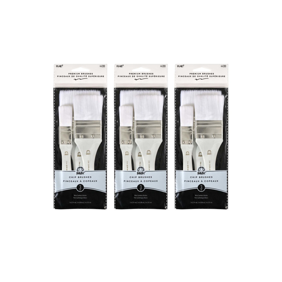 Apply a smooth, even coat of paint, stain, or glue with the Plaid White Nylon Chip Paint Brush Set. Add this universal brush set to your collection of acrylic paint brushes for all those large projects. Each paint brush has a natural wood handle and white nylon bristles - perfect for all your arts and crafts! These superior-quality paint brushes can be used on everything from home decor projects to smaller paper crafts. Make the Plaid White Nylon Chip Paint Brush Set an essential part of your art supplies for a reliable finish every time. Each set includes 3 brushes. Sold as 3 sets for a total of 9 brushes.