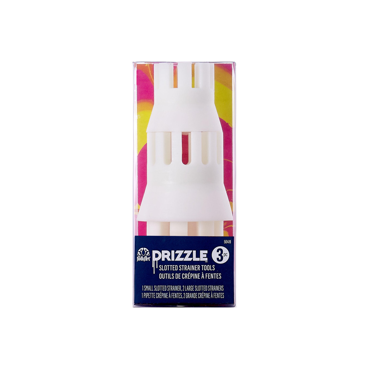 Acrylic paint pouring has never been easier than with the FolkArt Drizzle 3 piece Slotted Strainer Tool Set. These 3 slotted strainers will give your fluid art different visual effects to make a unique piece of art with FolkArt Drizzle Premium Pre-Mixed Fluid Pouring Acrylic Paint. Express yourself through loose and colorful art with these handy tools and ready-to-pour colors! Great for a variety of fluid art techniques - perfect for letting your creativity flow. There are no two pours that are alike! Explore and experience the freedom of expression through your fluid paintings and creations with each of these durable acrylic pouring paint supplies. Unleash your creativity with FolkArt Drizzle 3 piece Slotted Strainer Tool Set! Free your mind, free your color!