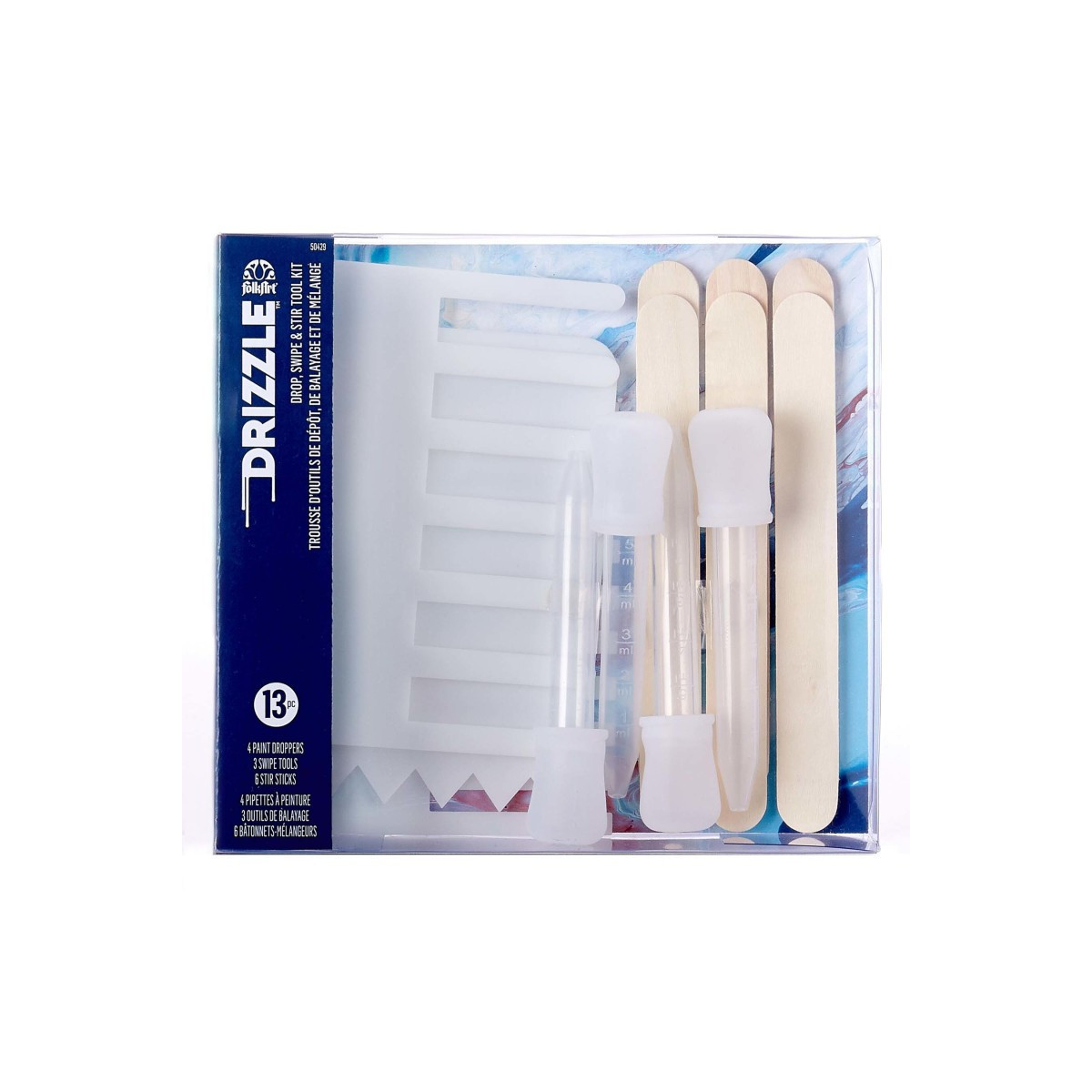Acrylic paint pouring has never been easier than with the FolkArt Drizzle Pouring Drop, Swipe, and Stir Tool Kit. This 13-piece tool kit provides you with a variety of tools to give your fluid art different visual effects when you use this kit with FolkArt Drizzle Premium Pre-Mixed Fluid Pouring Acrylic Paint. This kit includes 4 paint droppers, 6 wood stir sticks, and 3 swipe tools. Express yourself through loose and colorful art with these handy tools and ready-to-pour colors! Great for a variety of fluid art techniques - perfect for letting your creativity flow. There are no two pours that are alike! Explore and experience the freedom of expression through your fluid paintings and creations with these durable acrylic pouring paint supplies. Unleash your creativity with FolkArt Drizzle Pouring Drop, Swipe, and Stir Tool Kit! Free your mind, free your color!