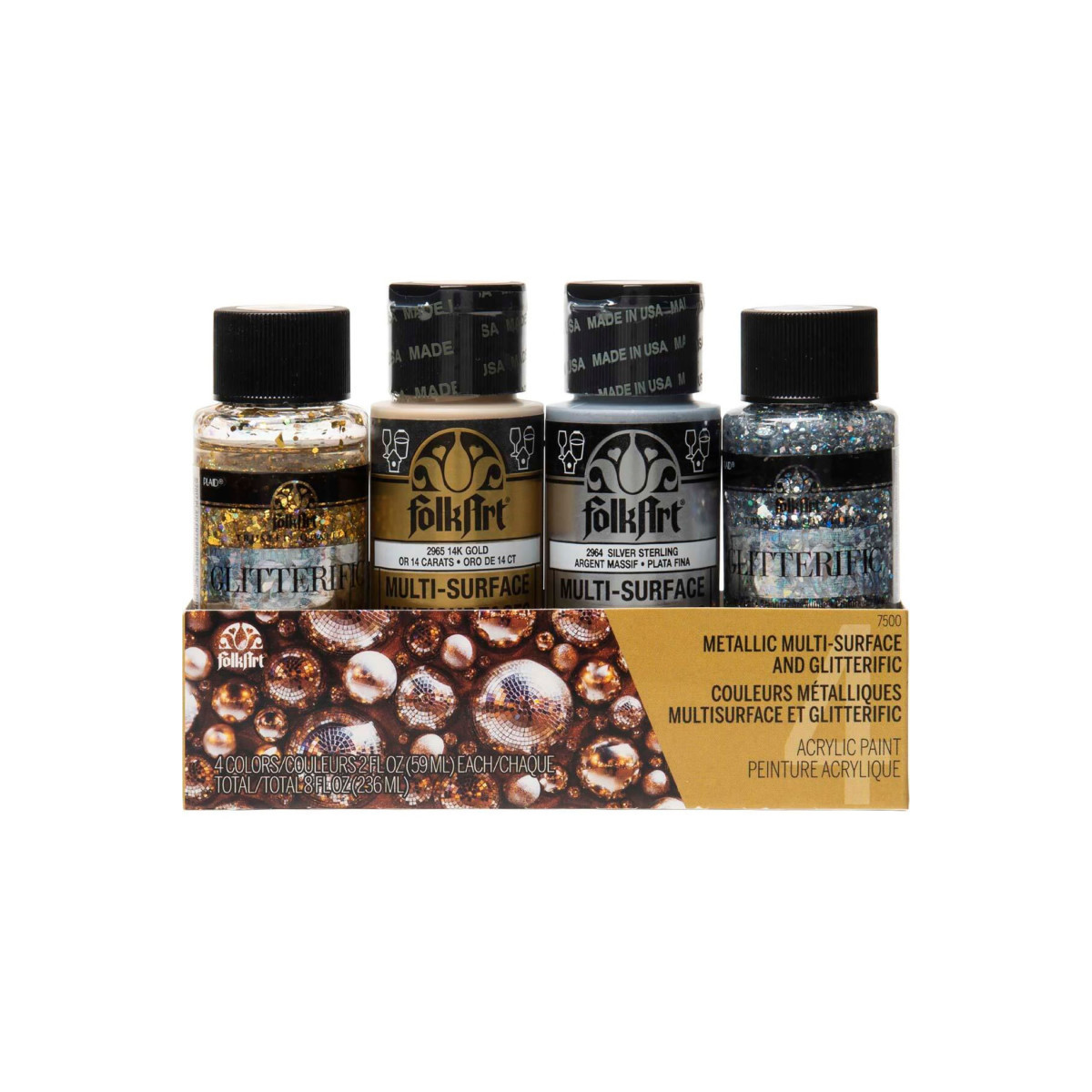 - VERSATILE & CONVENIENT SIZE - This shimmering acrylic paint set includes 4 total bottles of acrylic paint in 2 oz bottles. This set includes two FolkArt Glitterific colors Gold and Silver and two FolkArt Metallic colors Silver Sterling and 14k Gold