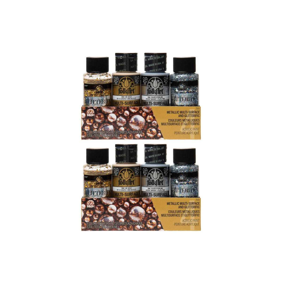 VERSATILE & CONVENIENT SIZE - Sold as 2 sets for a total of 8 paints, each shimmering acrylic paint set includes 4 total bottles of acrylic paint in 2 oz bottles. Includes FolkArt Glitterific colors Gold and Silver and FolkArt Metallic colors Silver Sterling and 14k Gold