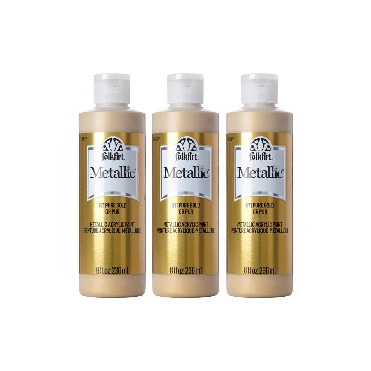 Add some shimmer to your next DIY project with FolkArt Metallic Acrylic Paint. This acrylic paint has a creamy and shiny consistency that brushes on smooth leaving a beautiful metallic finish. Our patented, self-sealing acrylic paint formula offers superior coverage and quicker drying times - making this a great paint for indoor and outdoor projects! Use on wood, paper, canvas, Styrofoam, paper mache, and so much more. This versatile acrylic paint allows you to do everything from beautiful hand paintings to stylish stenciling to design techniques to home decor DIYs and so much more. Give all your projects a modern, metallic twist with a layer of FolkArt Metallic Acrylic Paint. Sold as a pack of 3 bottles.