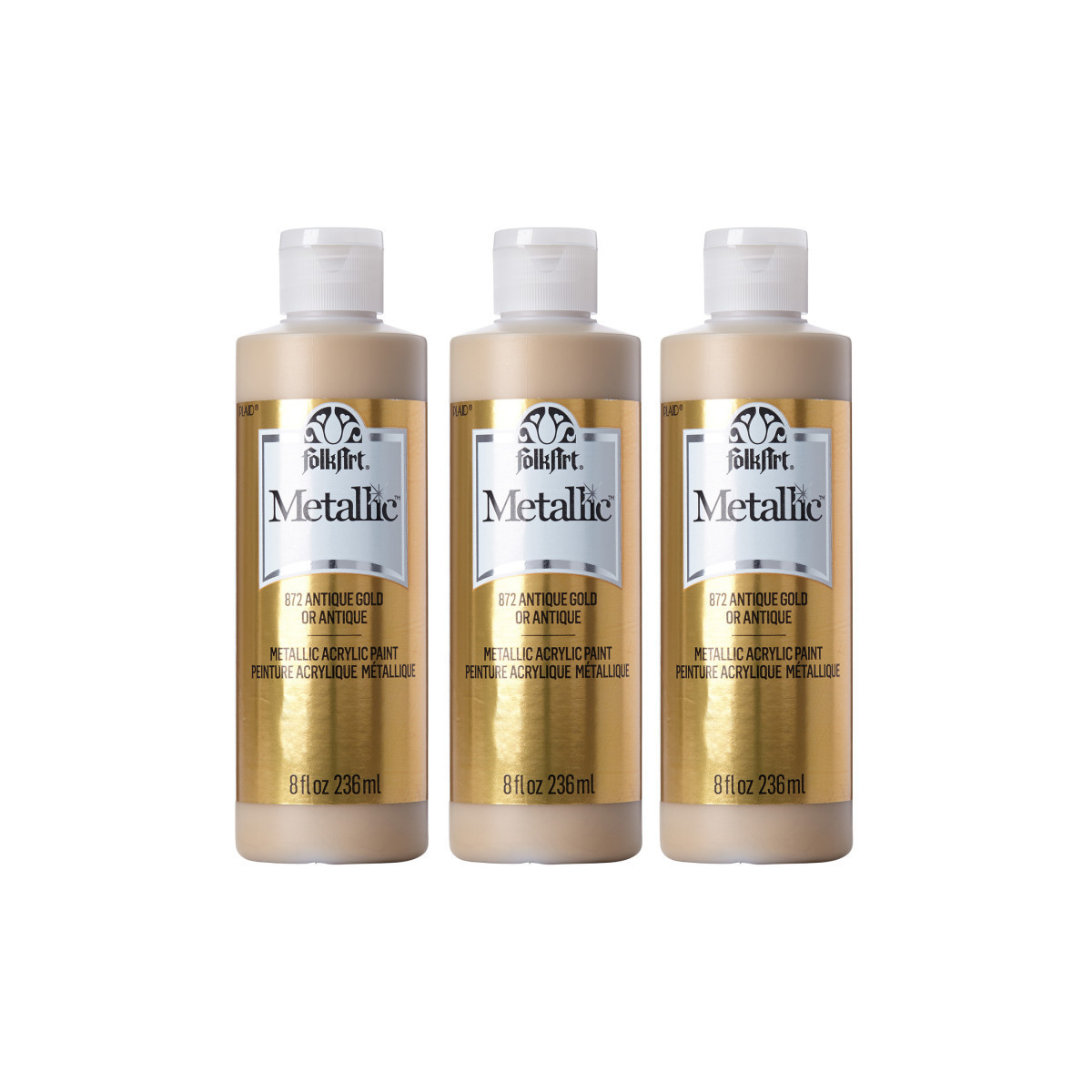Add some shimmer to your next DIY project with FolkArt Metallic Acrylic Paint. This acrylic paint has a creamy and shiny consistency that brushes on smooth leaving a beautiful metallic finish. Our patented, self-sealing acrylic paint formula offers superior coverage and quicker drying times - making this a great paint for indoor and outdoor projects! Use on wood, paper, canvas, Styrofoam, paper mache, and so much more. This versatile acrylic paint allows you to do everything from beautiful hand paintings to stylish stenciling to design techniques to home decor DIYs and so much more. Give all your projects a modern, metallic twist with a layer of FolkArt Metallic Acrylic Paint. Sold as a pack of 3 bottles.
