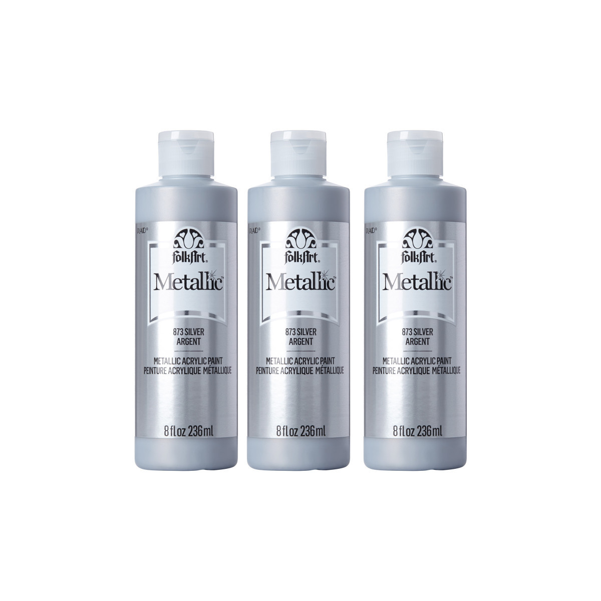 Add some shimmer to your next DIY project with FolkArt Metallic Acrylic Paint. This acrylic paint has a creamy and shiny consistency that brushes on smooth leaving a beautiful metallic finish. Our patented, self-sealing acrylic paint formula offers superior coverage and quicker drying times - making this a great paint for indoor and outdoor projects! Use on wood, paper, canvas, Styrofoam, paper mache, and so much more. This versatile acrylic paint allows you to do everything from beautiful hand paintings to stylish stenciling to design techniques to home decor DIYs and so much more. Give all your projects a modern, metallic twist with a layer of FolkArt Metallic Acrylic Paint. Sold as a pack of 3 bottles.
