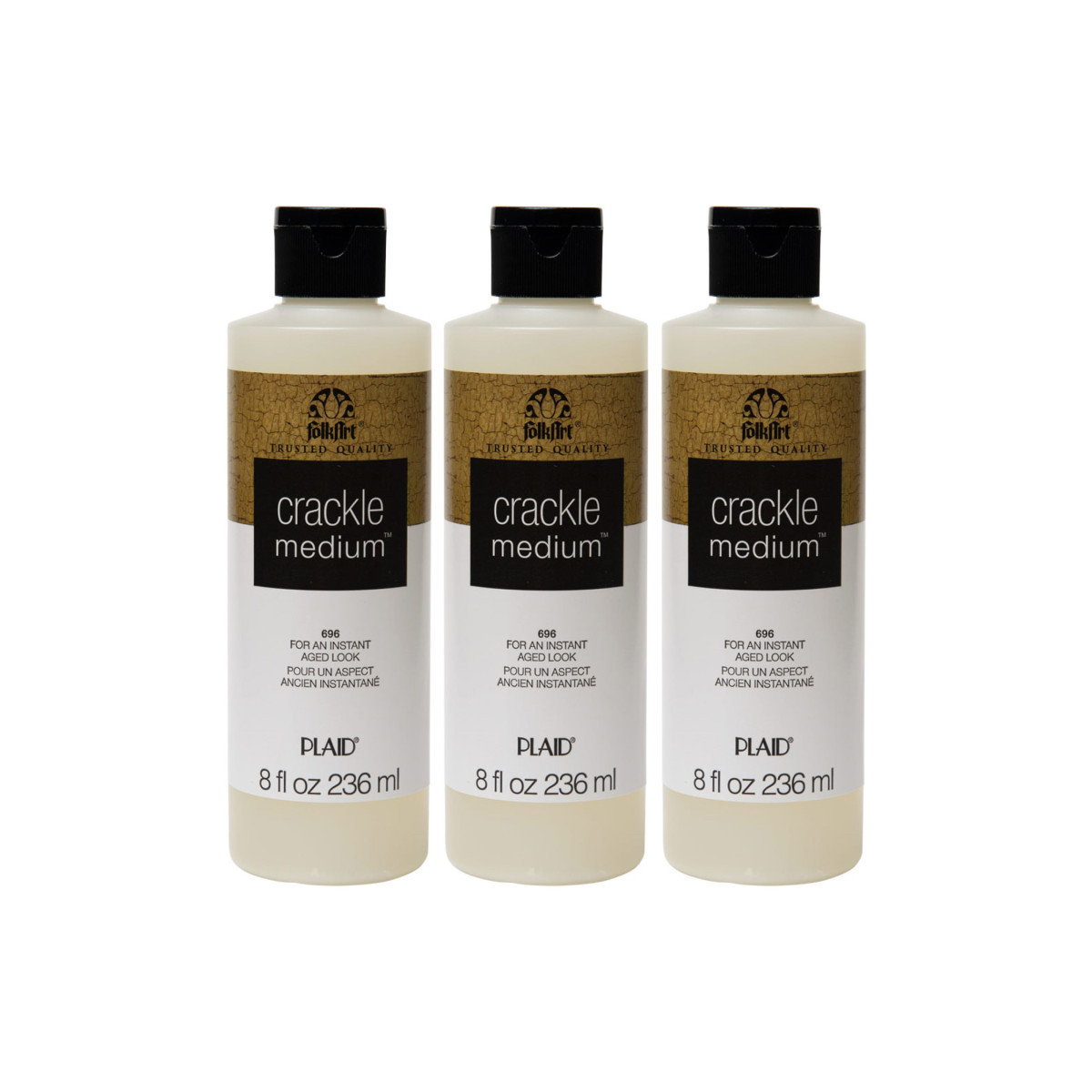 Give your project a rustic home decor look with the FolkArt Crackle Medium. Formulated to give you a realistic rust and worn appearance, this water-based medium is easy to use with your favorite FolkArt Acrylic Paints. Simply basecoat your surface, then allow to dry 1 hour in between coats. Next apply a contrasting topcoat and then the crackle medium. The crackling effect will show through after the paint has dried. This unique formula is easy to use and fun to experiment with! Create a rustic look on everything from picture frames to signage to dining sets and more. Explore the unique crafting possibilities with FolkArt Crackle Medium. Sold as a pack of 3 bottles.