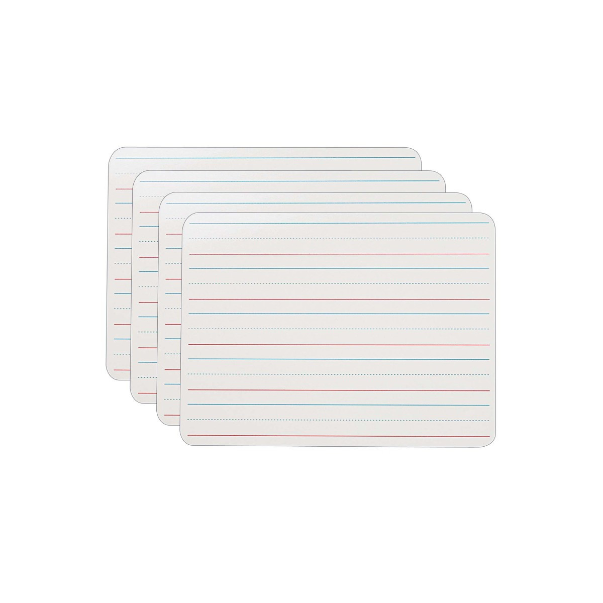 Two-sided red & blue ruled dry erase boards are great for teaching and practicing fundamentals at the early learner stage. Bright white board contains 5 sets of blue headline and broken mid-line plus red baseline format. Each line set measures 1-1/8" with 3/8" of blank descender space between sets. Back side is plain white dry erase. Boards feature a high-quality, non-ghosting write-and-wipe surface with smooth, rounded edges and corners. Hardboard backing will not warp or chip. Measure 12" x 9" x 0.125" thick. Sold as a pack of 4.