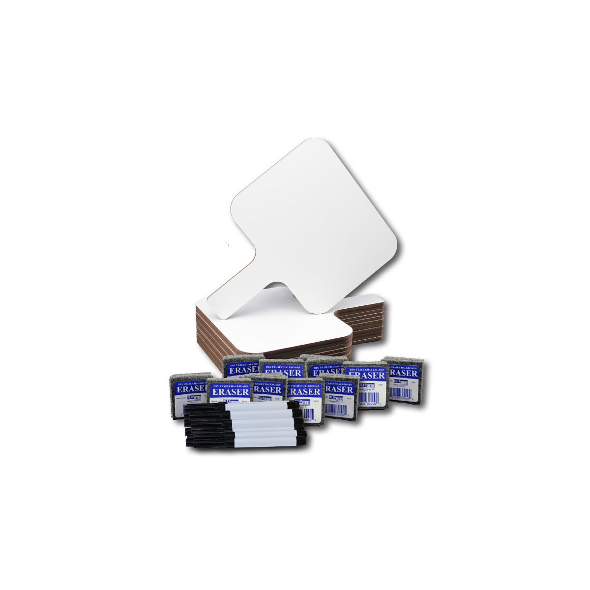 - Set includes 12 paddles, 12 felt erasers, and 12 black dry erase pens