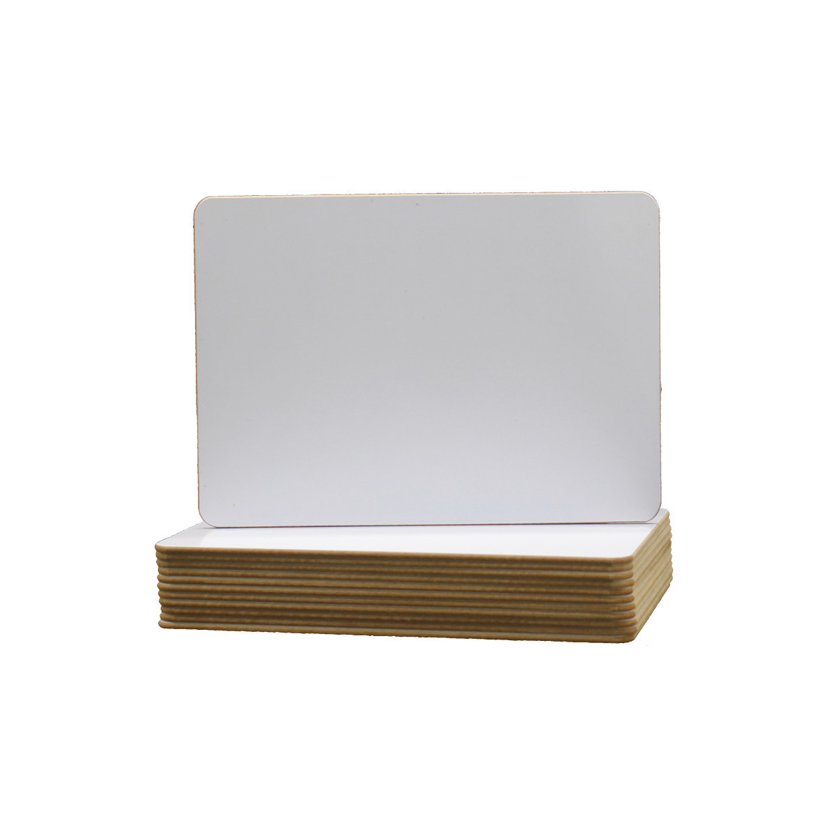 Economical, unframed lap board with a plain dry erase surface is ideal for doodling, math or handwriting practice and more! Great for school, office or home use. Quality write-and-wipe surface is non-ghosting. Hardboard backing is warp and chip resistant. Rounded corners and smooth edges for safety and comfort. Measures 9.5" x 12" x 0.125". Pack of 12.