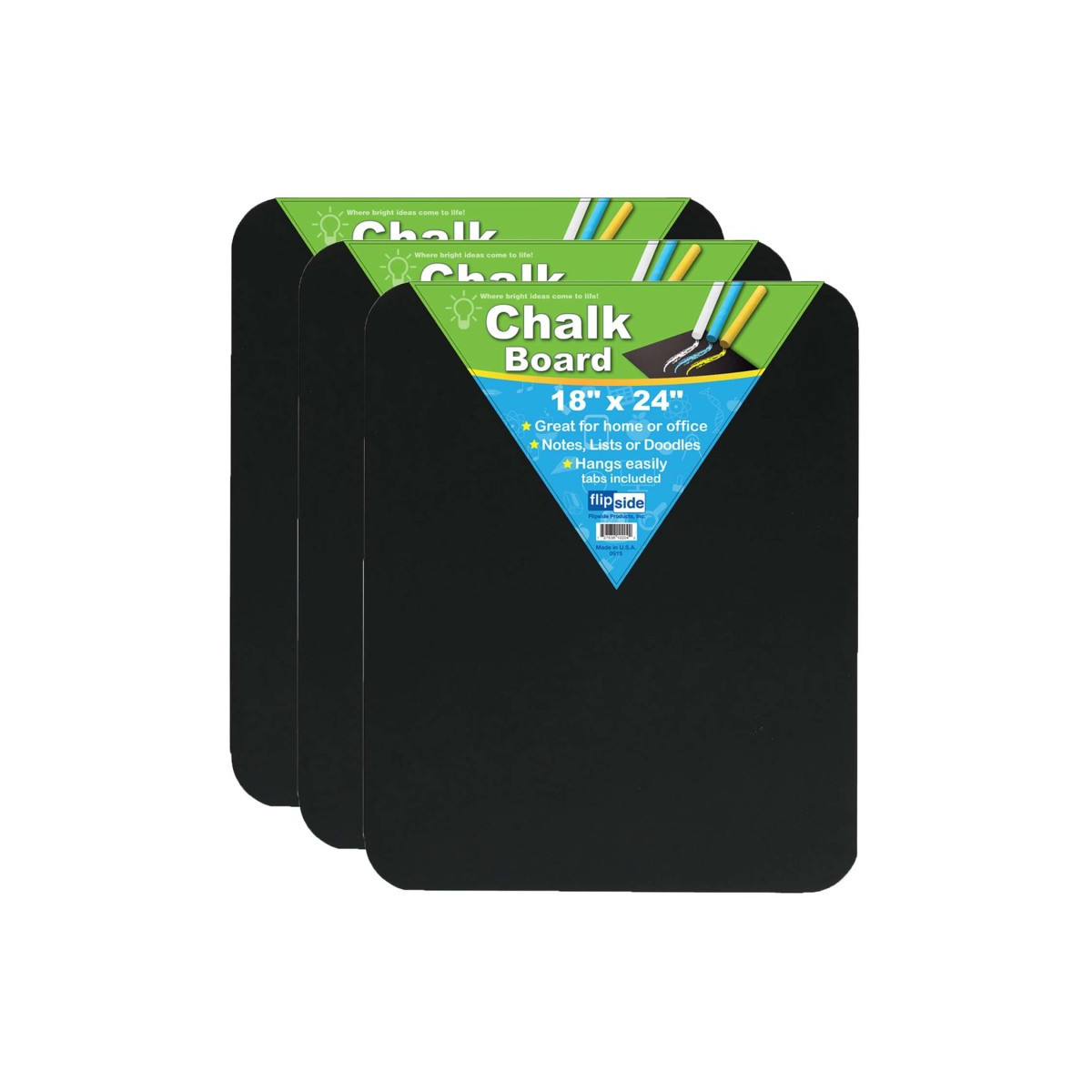 Save paper by using a time-tested and reusable writing surface. Black chalkboards are the perfect size for school, office, and home message centers. Works well for handwriting practice, working equations, brainstorming, and more. Rounded corners and smooth edges for safety and comfort. For use with white and color chalk and felt erasers. Hardboard backing is warp and chip resistant. Comes with adhesive squares for mounting. Measures 18" x 24" 0.125". Pack of 3 chalkboards.