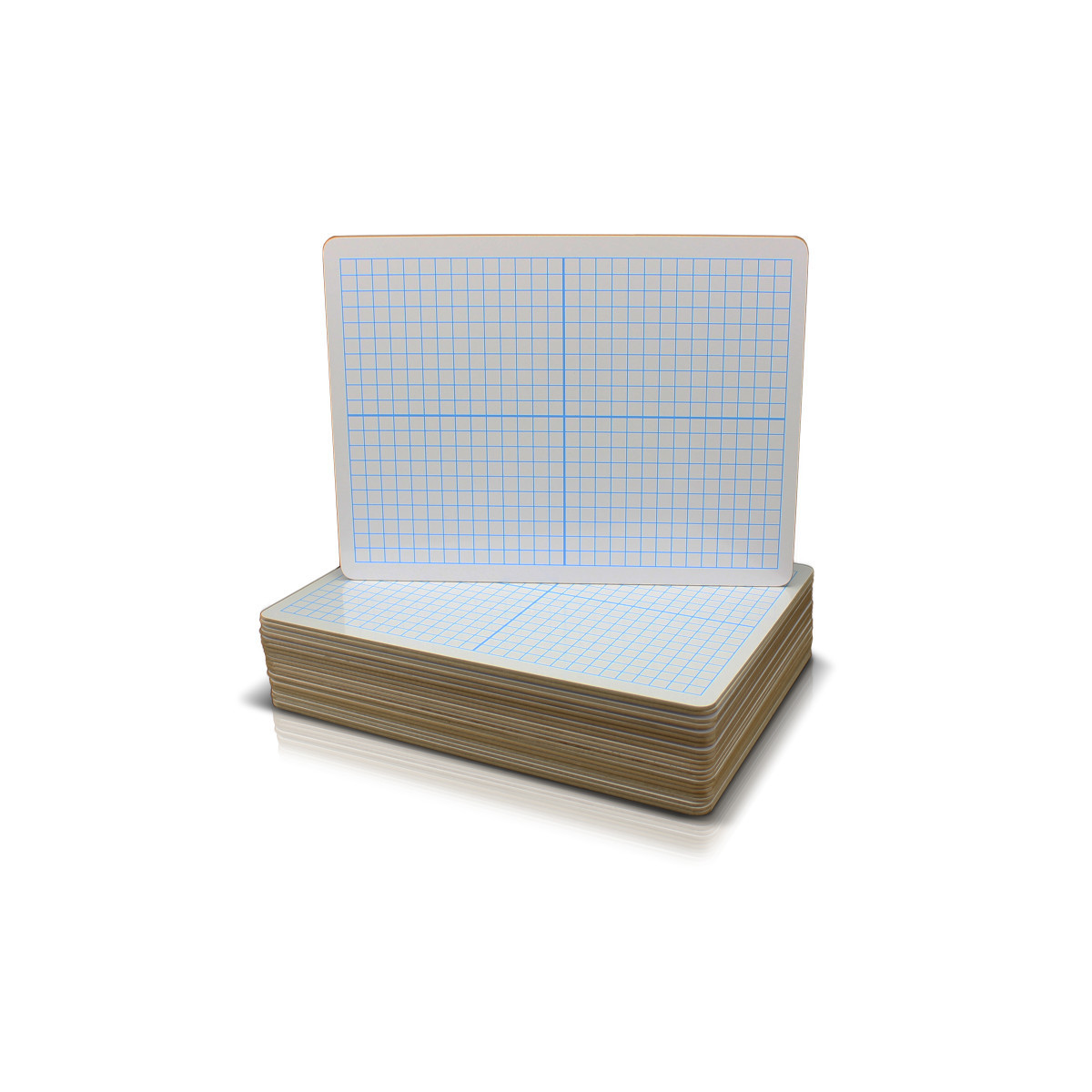 Economical, unframed lap boards feature a blue XY axis dry erase grid on one side and plain dry erase on the other. These boards are durable and are an invaluable teaching aide. Write, wipe and use again and again with no waste. Durable hardboard backing is warp and chip resistant. Non-ghosting dry erase surface with rounded corners and smooth edges for safety and comfort. Dry erase board measures 9" x 12" x 0.125". Bold lines separate the board into quadrants each 14 squares x 10 squares, total grid is 28 squares x 20 squares. Individual squares measure 3/8" x 3/8". Pack of 24.
