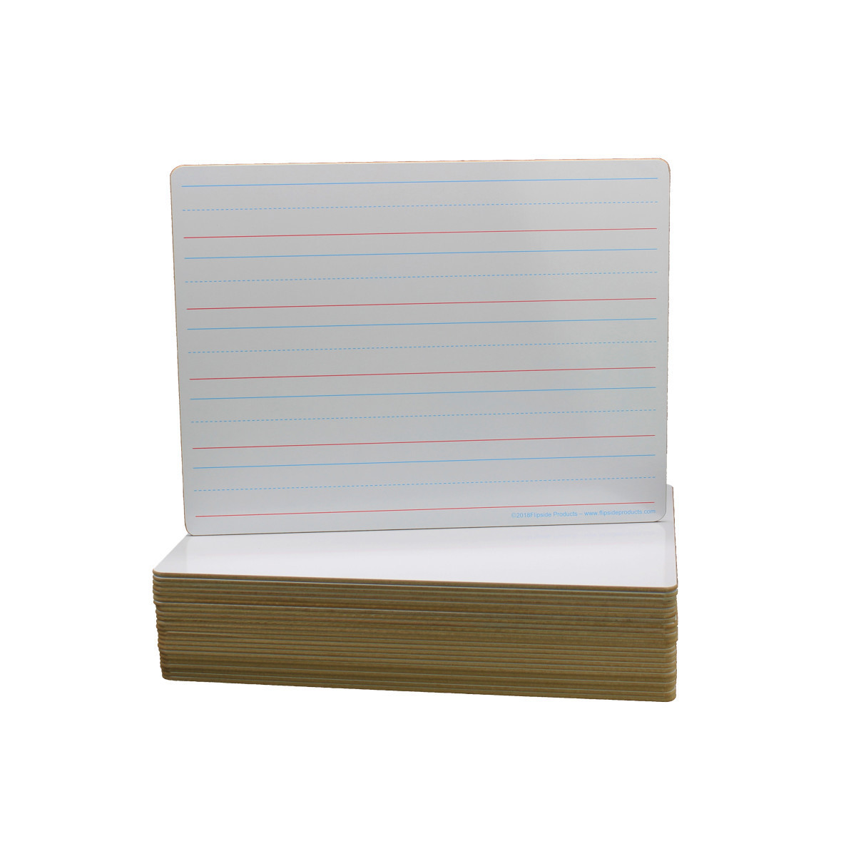 Ideal for teaching and practicing fundamentals at the early learner stage! Each bright white board contains 5 sets of blue headline and broken mid-line plus red baseline format. Each line set measures 1-1/8" with 3/8" of blank descender space between sets. Back side is plain white dry erase. Boards feature a non-ghosting dry erase surface with smooth, rounded edges and corners for comfort and safety. Measures 12" x 9" x 0.125" thick. Class pack includes 24 boards.