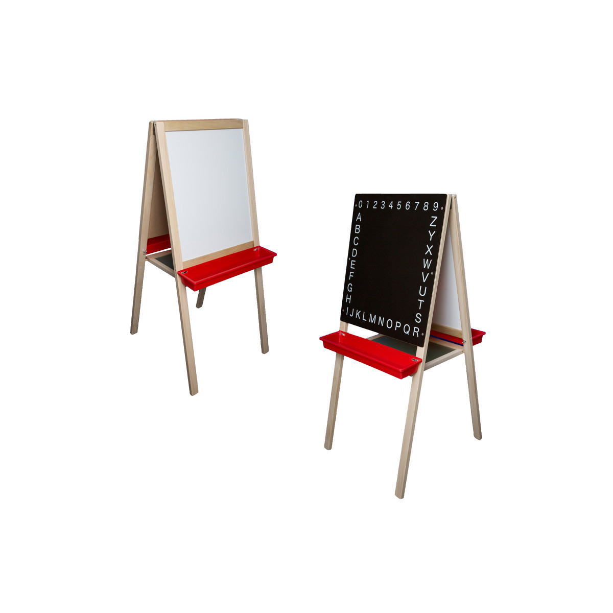 Easel features a white magnetic dry erase surface on one side and a black alphabetic chalkboard on the reverse