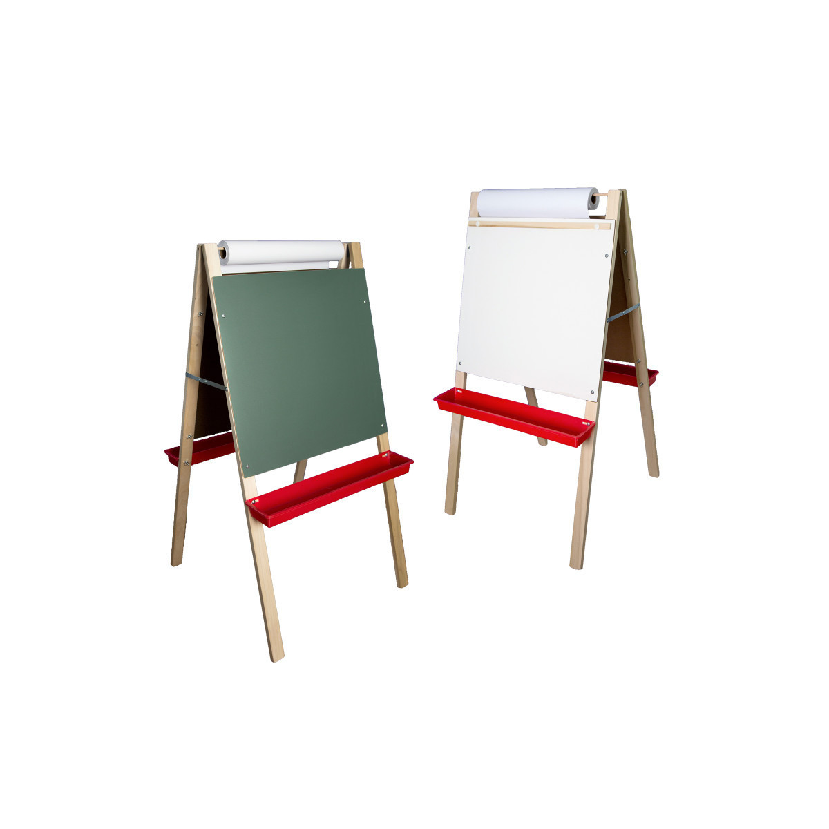 The Adjustable Paper Roll Easel is a multi-functional easel has a dry erase board on one side and a chalkboard on the reverse. Includes an 18" x 100' roll of craft paper and two rugged plastic trays. Finger friendly leg brackets hold easel open and collapse flat for quick storage. Boards are adjustable to two heights. Measures 48" T x 24" W.