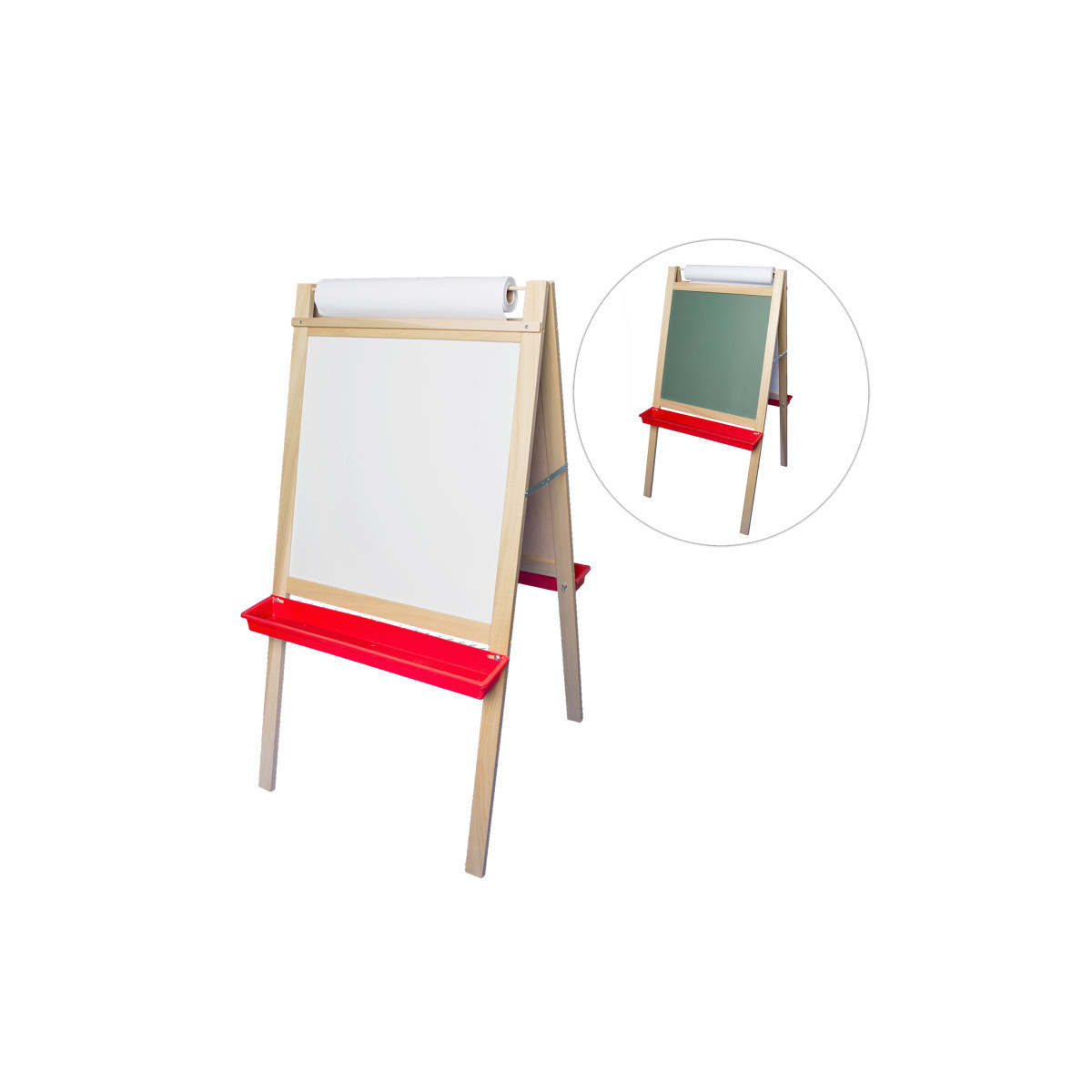 This deluxe easel features a magnetic dry-erase board on one side and a green chalkboard on the reverse as well as a top mounted 18" x 100' paper roll. Double hinged for stability at the top, two rugged trays and sturdy steel leg braces. Measures 48" T x 24" W.