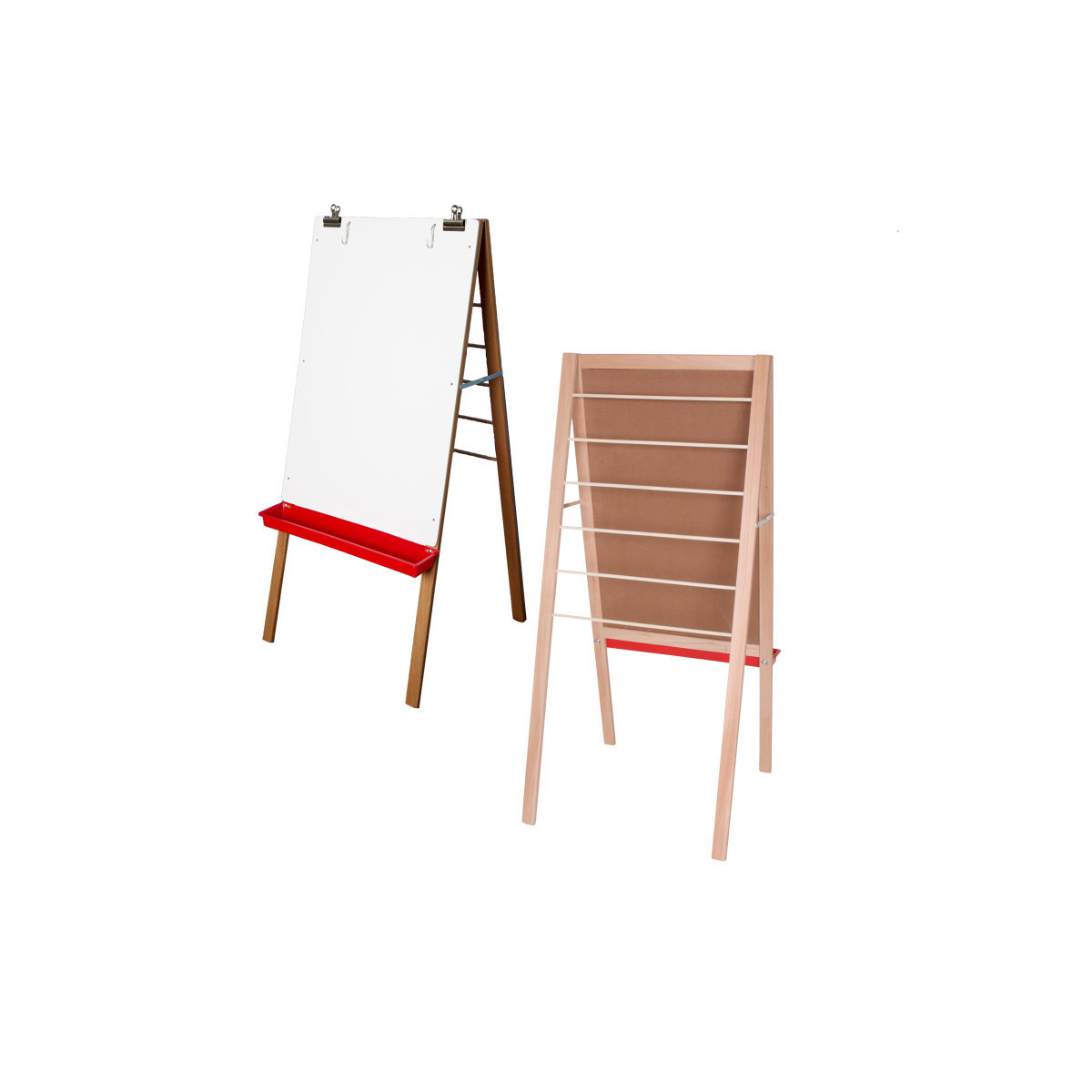 Great for the young artist, our painting easel features a 24" x 36" dry-erase board that wipes clean. Two sturdy clips and two "S" hooks for hanging single sheets or pads. Back of easel has six dowels to hang and dry your paintings. Includes a rugged plastic tray that holds six paint cups. Folds flat for storage. Measures 54" T x 24" W.