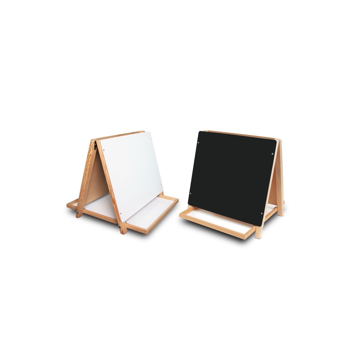 Table Top Easel is great for the classroom, daycare center, and home! They are designed for table top use. This easel features a white dry-erase surface on one side and a black chalkboard on the reverse. Large center tray provides useful storage space. The small size is perfect for use by children. Kids can practice their writing and drawing with the Table Top Easel. Measures 18.5" H x 18" W.