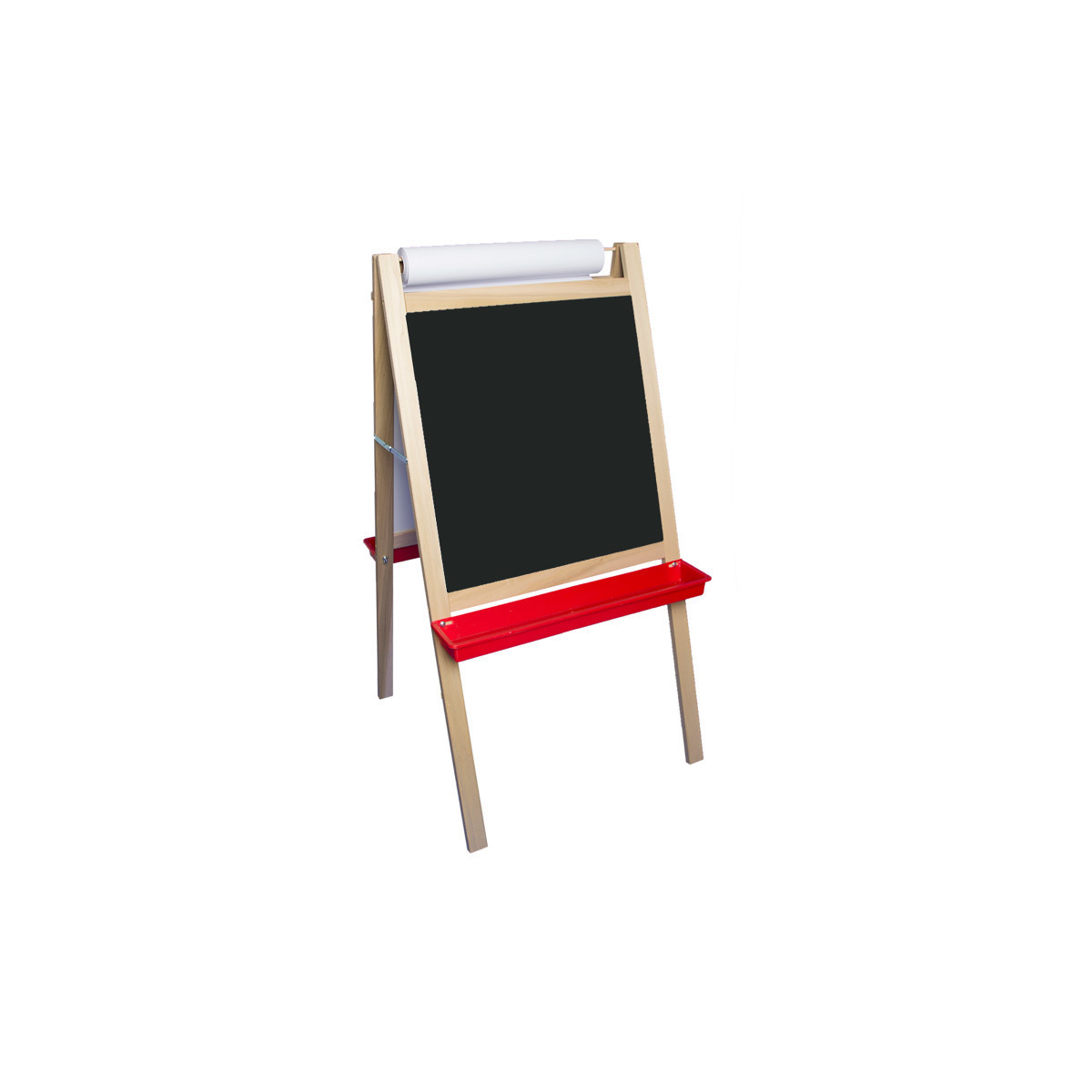 This full size deluxe easel features a magnetic dry-erase board on one side and a black chalkboard on the reverse, as well as a top mounted 18" x 100' craft paper roll. Children, parents, and teachers alike will love the ability to create, display, and teach using this easel. Double hinged for stability at the top, it features two built in rugged trays and sturdy steel leg braces. The solid wood construction measures 48" x 24".