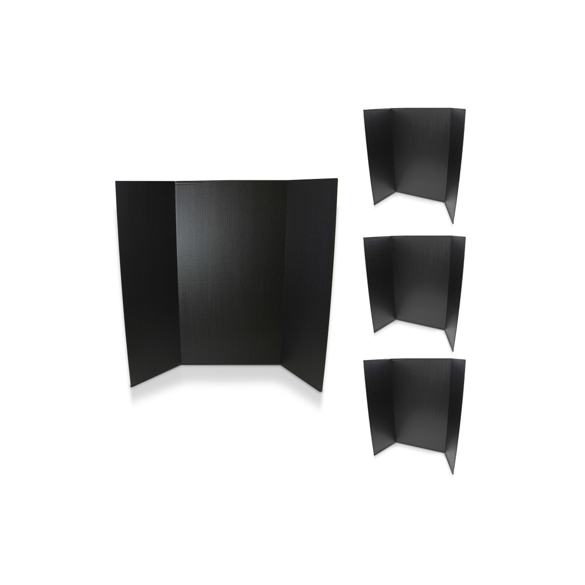 Our project display boards allow you to customize and easily create a lasting impression. The durable, smooth, bright color surface has a slight glossy finish that easily allows markers, glue, paint and adhesive. These project boards are great for science fairs, presentations, picture displays, school projects and tabletop exhibits. You can easily transport your project board because of the overlapping side panels. Our project boards have color on one side and natural brown kraft on the back. Made from 1-ply corrugated paper that is 100% recyclable. It measures 36" H x 48" W. Side panels measure 36" H x 12.75" W. Center panel measures 36" H x 22.5" W. Pack of 4 black project boards.
