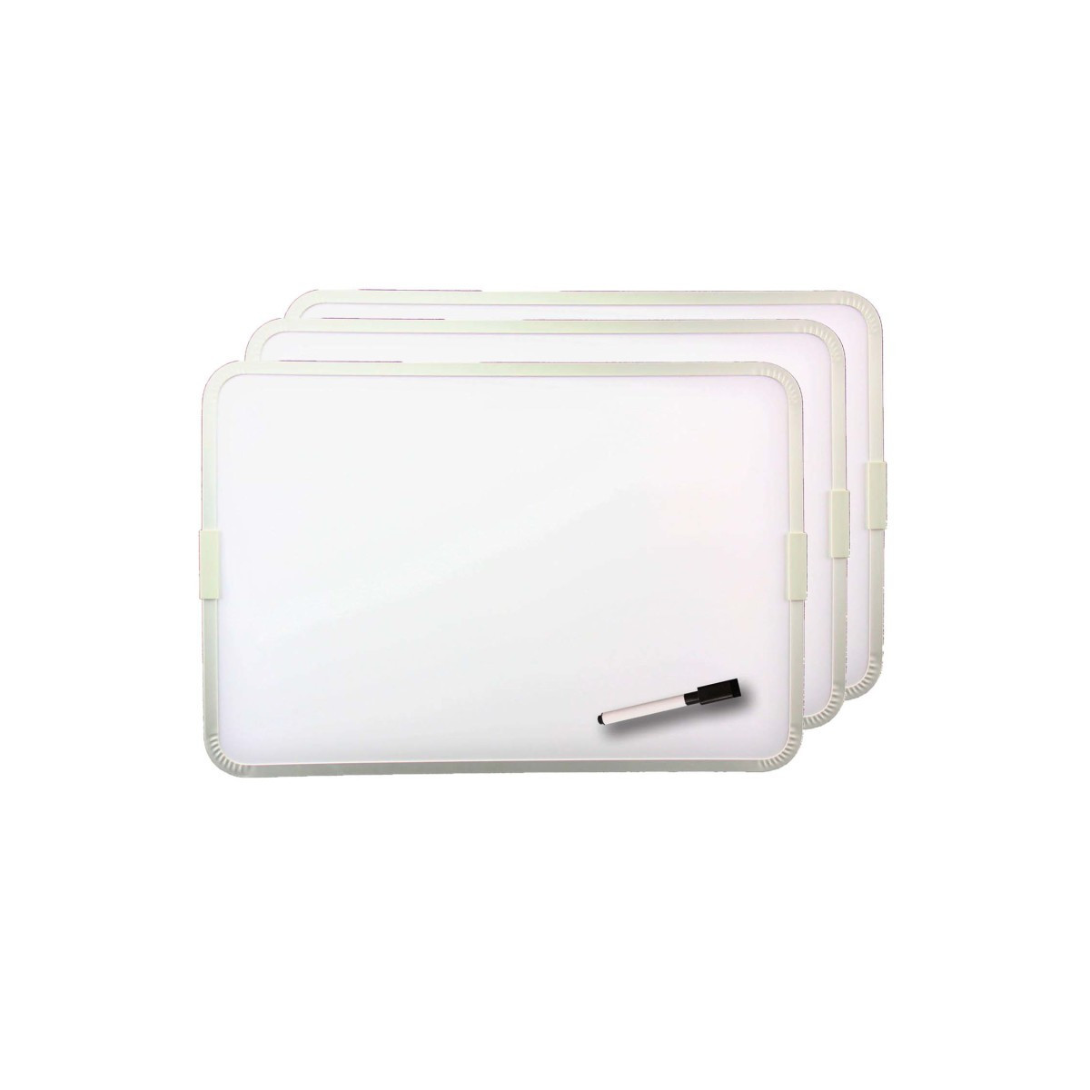 Both dry erase and magnetic, this board is perfect for use in a classroom, at home, or at the office. Features a magnetic and non-magnetic side for use. Comes with a magnetic dry-erase marker pen with cap eraser. Measures 12" x 17.5". Pack of 3 boards, each with marker.