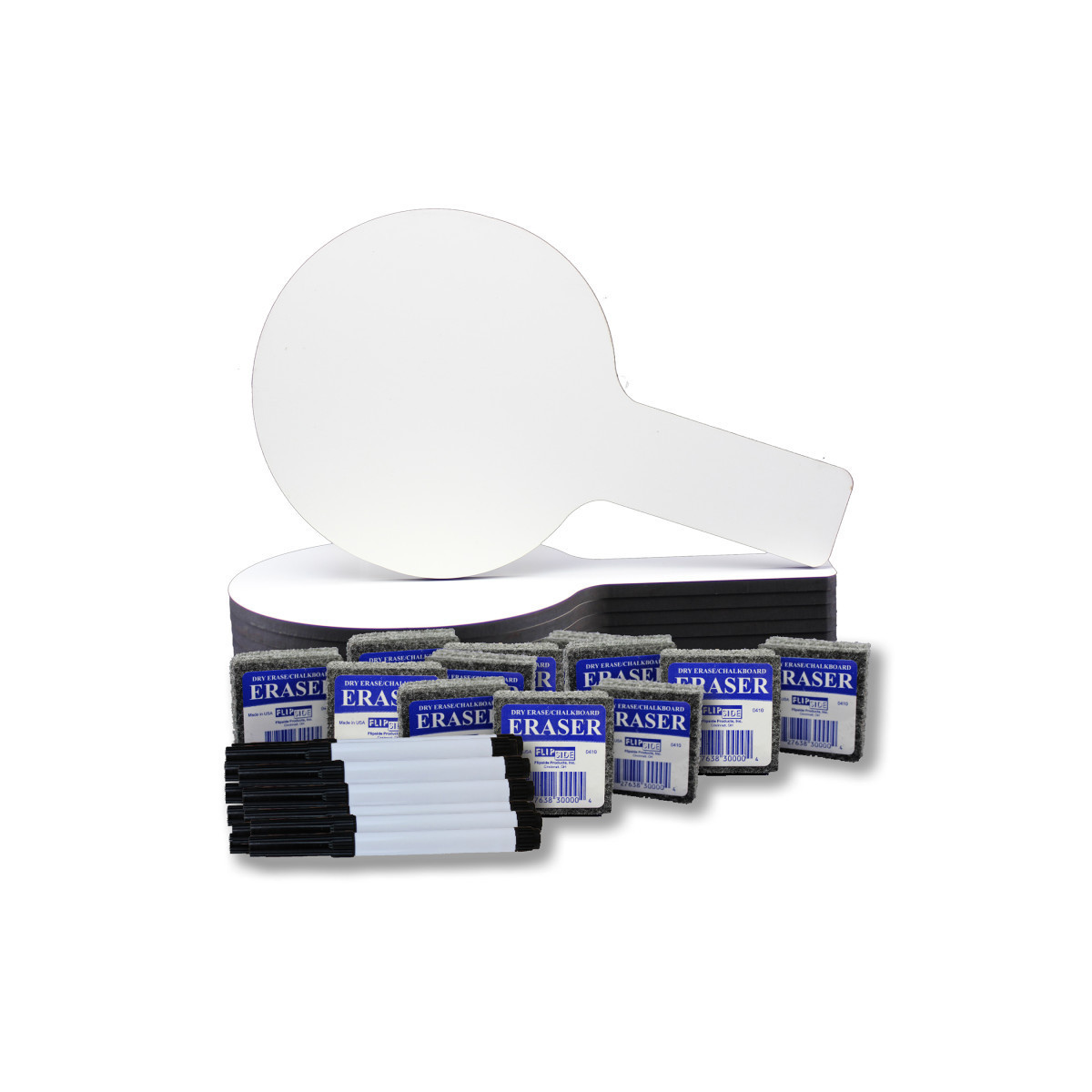 Quick and quiet whole class participation made easy with Mini Answer Paddles. Great for review sessions, surveys, assessments, and more! Non-ghosting dry erase surface with a rounded shape, an easy grip handle and smooth edges. Hardboard backing is warp and chip resistant. Make everything more fun with dry erase paddles. Boards measure 5" x 9". Set of 12 paddles, 12 erasers, and 12 black dry erase markers.