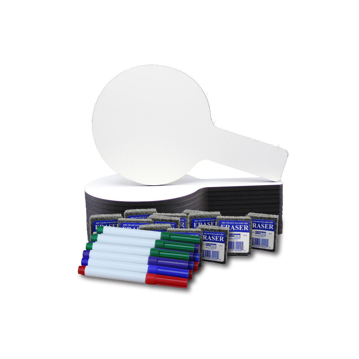 Quick and quiet whole class participation made easy with Mini Answer Paddles. Great for review sessions, surveys, assessments, and more! Non-ghosting dry erase surface with a rounded shape, an easy grip handle and smooth edges. Hardboard backing is warp and chip resistant. Make everything more fun with dry erase paddles. Paddles measure 5"W x 9"T. Set of 12 paddles, 12 erasers, and 12 assorted color markers (3 of each color; red, blue, purple, and green).