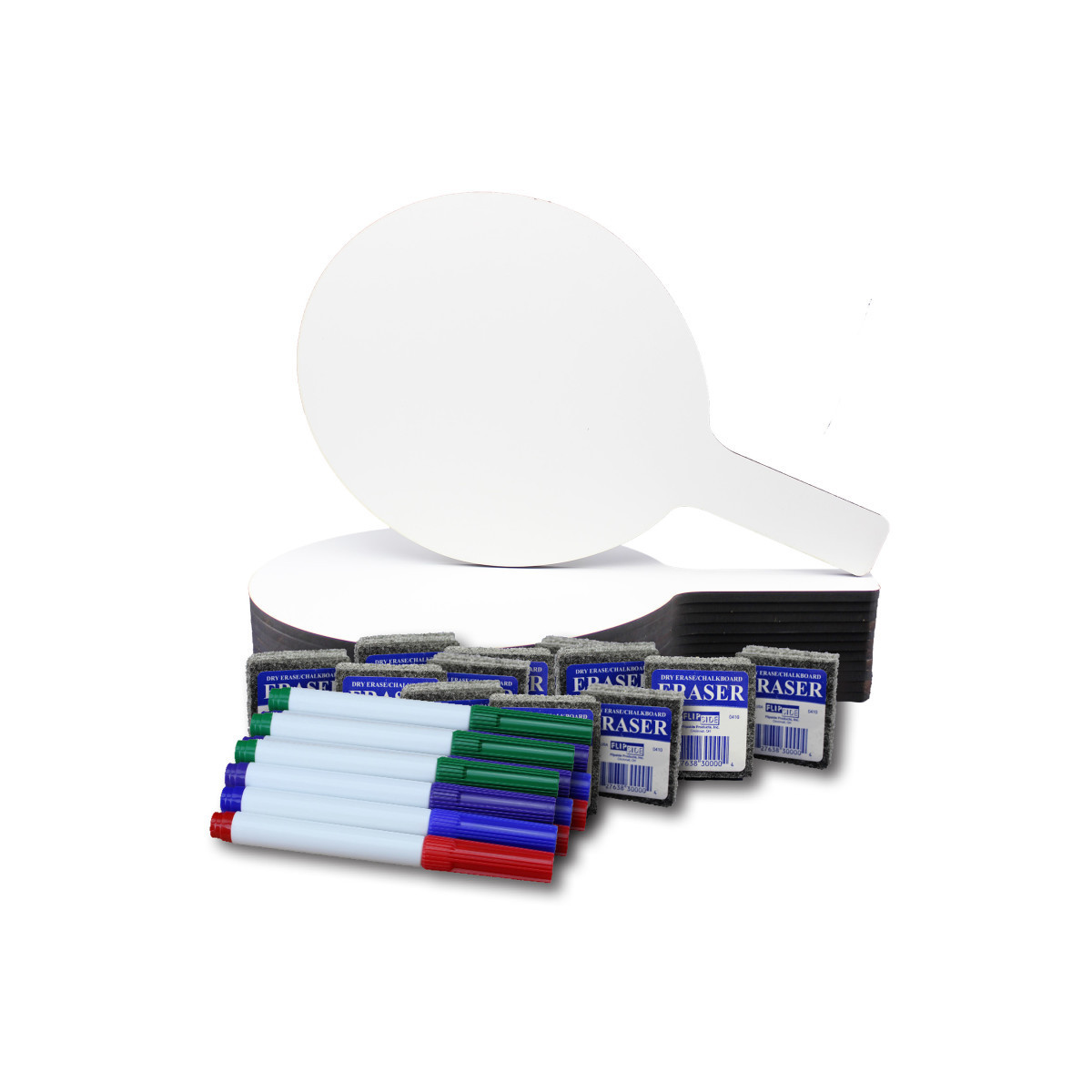 Make everything more fun with dry erase paddles. Quick and quiet whole class participation is made easy with oval answer paddle set with handy dry erase pen and student eraser. Great for review sessions, surveys, assessments, and more! High quality, non-ghosting dry erase surface with an easy grip handle and smooth edges. Paddles measure 7"W x 12" T. Set includes 12 paddles, 12 felt erasers, and 12 assorted color dry erase pens (3 of each color; red, blue, purple, green).