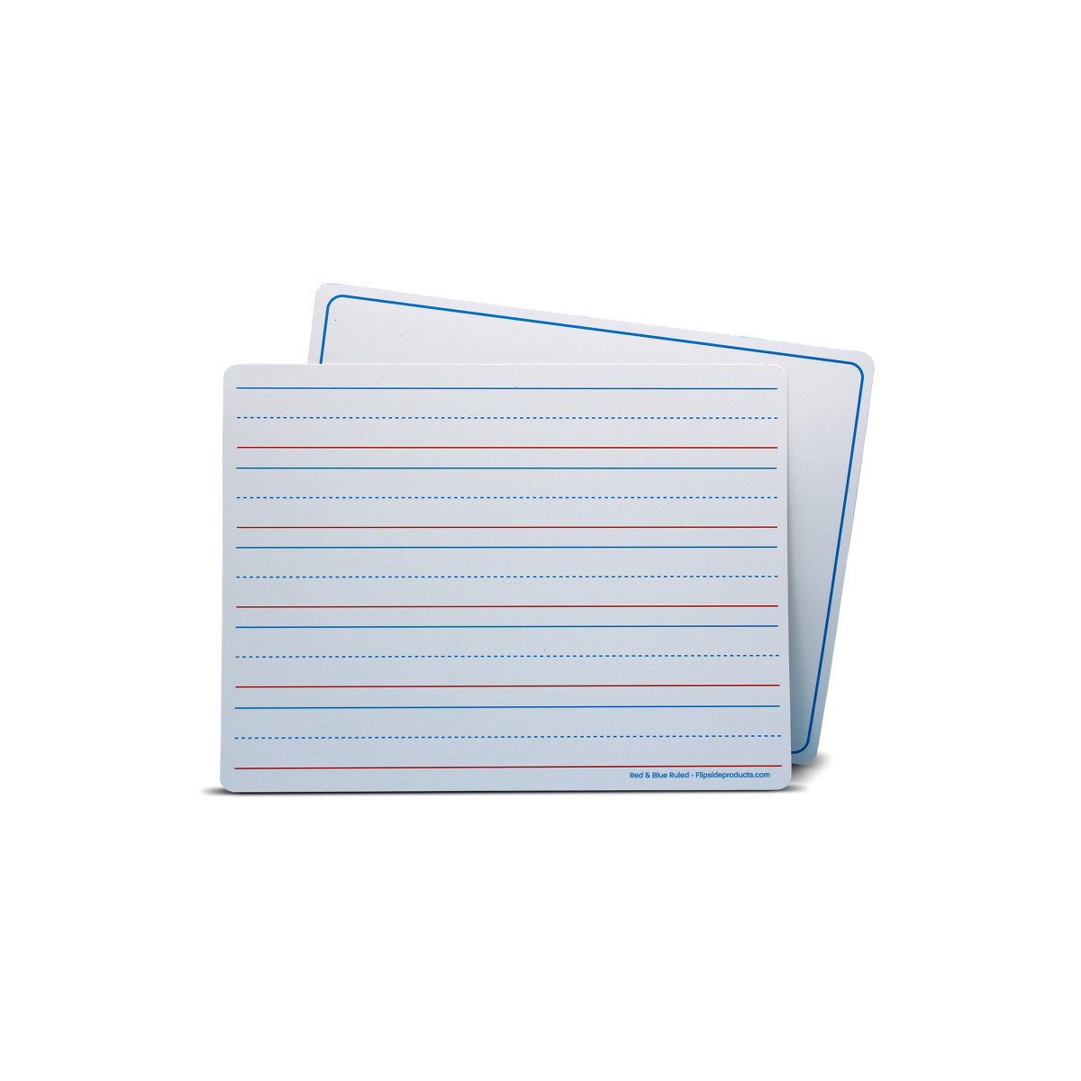 Two-Sided, Red & Blue Ruled Dry Erase Learning Mats are great for teaching and practicing fundamentals at the early learner stage. The bright white sheets contain 5 sets of blue headlines and broken mid-lines plus, a red baseline format. Each line set measures 1 1/8" with 3/8" of blank descender space between sets. The back side is plain white, dry erase with a blue border. The mats feature a high-quality, non-ghosting write-and-wipe surface with smooth, rounded edges and corners. The learning mats measure 9" x 12". Each pack includes 12 individual mats.