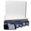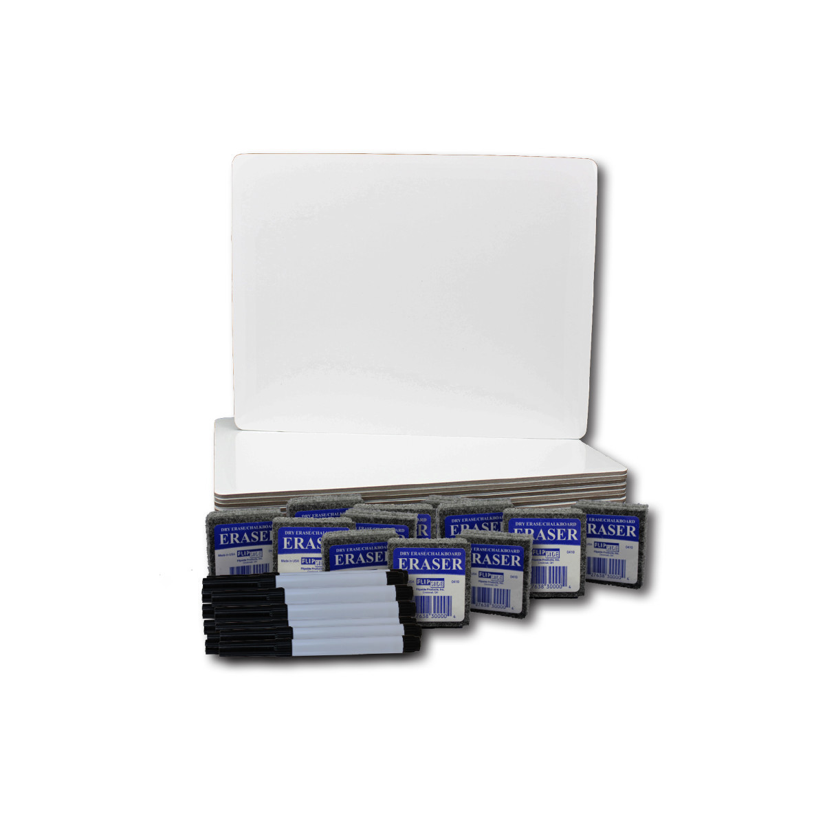 Economical, unframed plain dry erase board, pen, and eraser set is ideal for academic practice and doodling at home, school, or travel! Quality write-and-wipe board surface is non-ghosting with rounded corners for safety and comfort. Set includes 12 dry erase boards, (12) 2" x 2" felt erasers, and 12 black dry erase pens. Backing is warp and chip resistant. Boards measure 9" x 12" x 0.125".