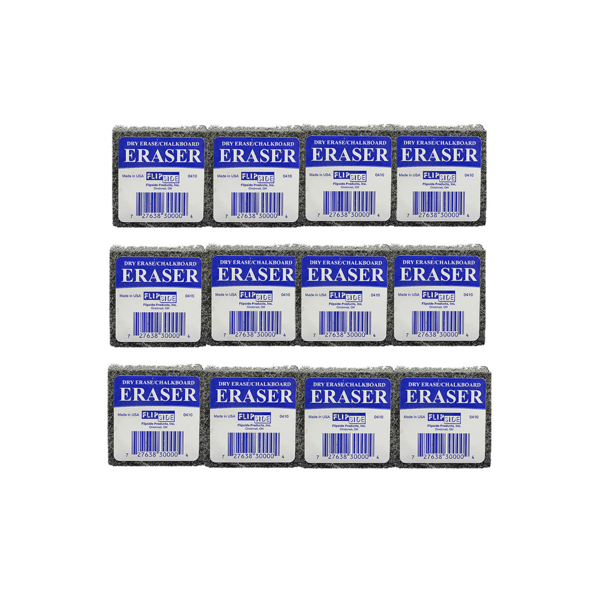 Erasers for dry erase and chalk boards are sized with students' hands mind. One piece dense felt construction will not unravel for extra long use. Works for both dry erase/chalk surfaces. Erasers measure 2" x 2" x 1". Class Pack 12. Made in USA.