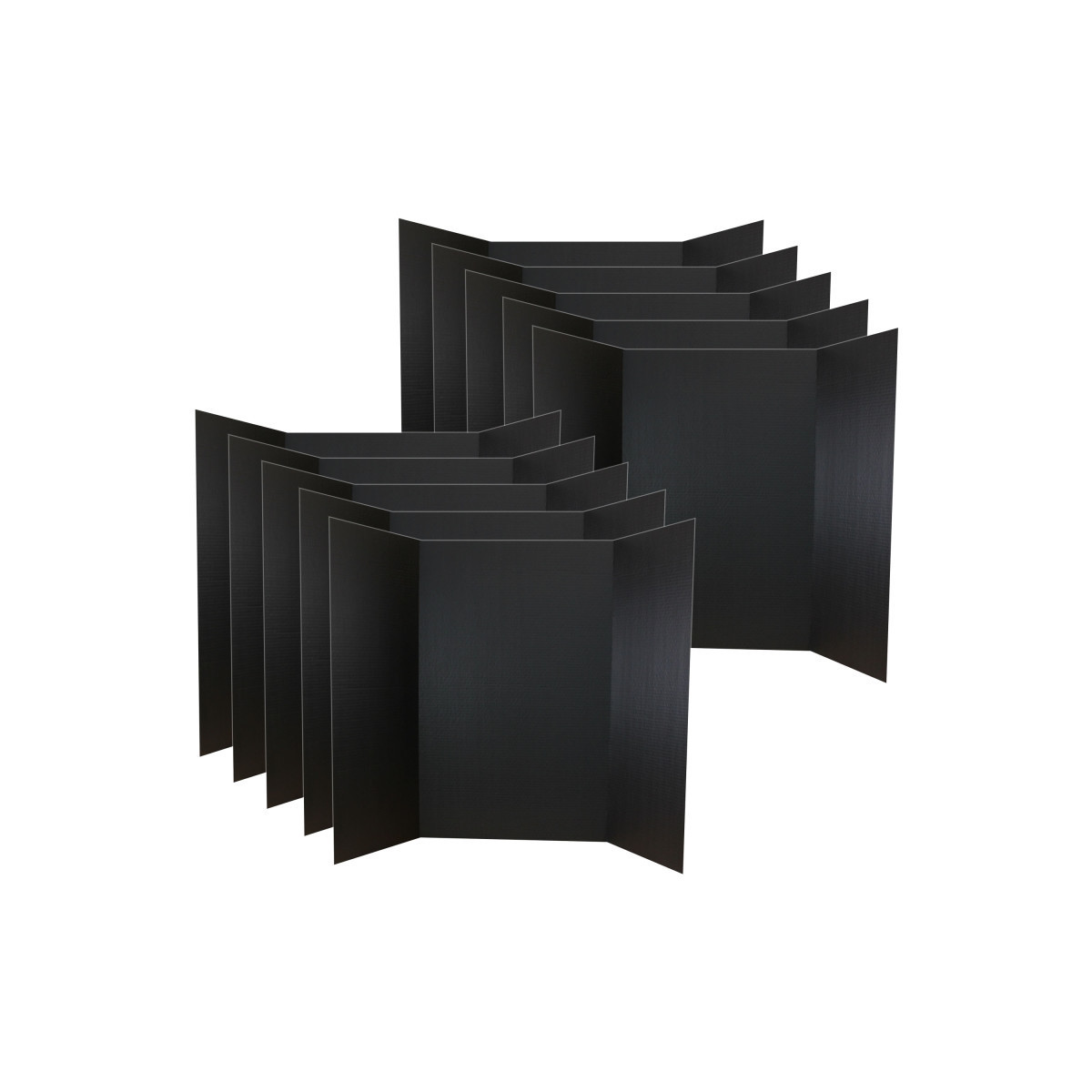 Our project display boards allow you to customize and easily create a lasting impression. The durable, smooth, bright surface has a slight glossy finish that easily allows markers, glue, paint and adhesive. These project boards are great for science fairs, presentations, picture displays, school projects and tabletop exhibits. You can easily transport your project board because of the overlapping side panels. Our project boards have color on one side and natural brown kraft on the back. Made from 1-ply corrugated paper that is 100% recyclable. Project boards measure 36" H x 48" W. Side panels measure 36" H x 12.75" W. Center panel measures 36" H x 22.5" W. Pack of 10 black project boards.