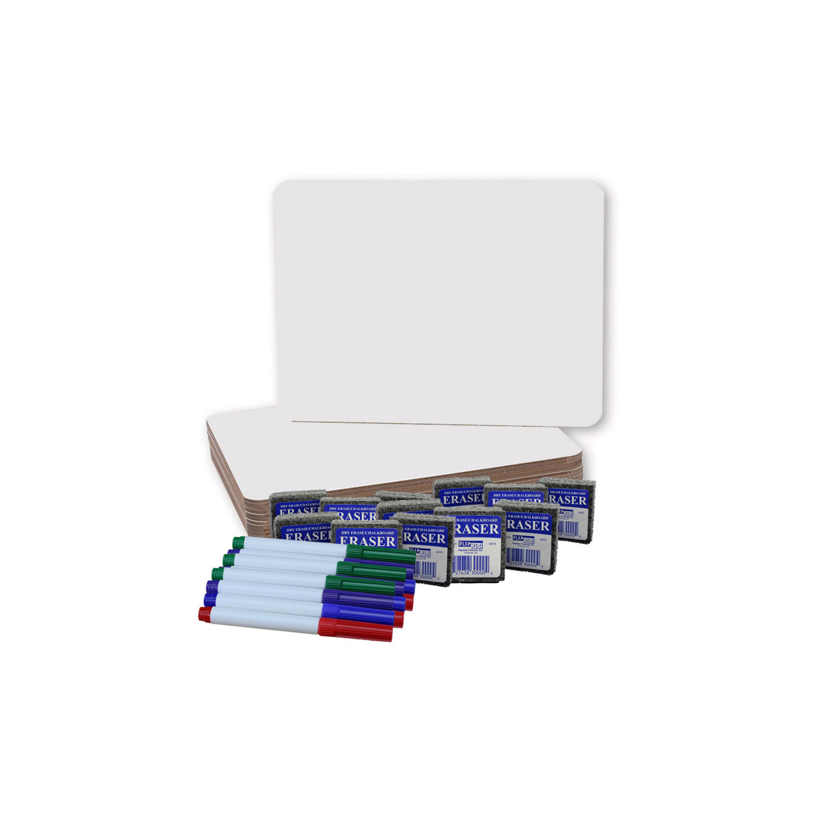 From quick reminders to a day's worth of assignments, plain dry erase boards are the workhorse of any busy household, school, or workplace. Our frameless boards do the job at a fraction of the cost of framed boards and come in a convenient set with colored markers and erasers. Ideal for quick response lessons and games. Easy to hold. Each set contains 12 boards, 12 erasers, and 12 pens; 3 of each color - blue, green, red, and purple. Boards measure 9" x 12".