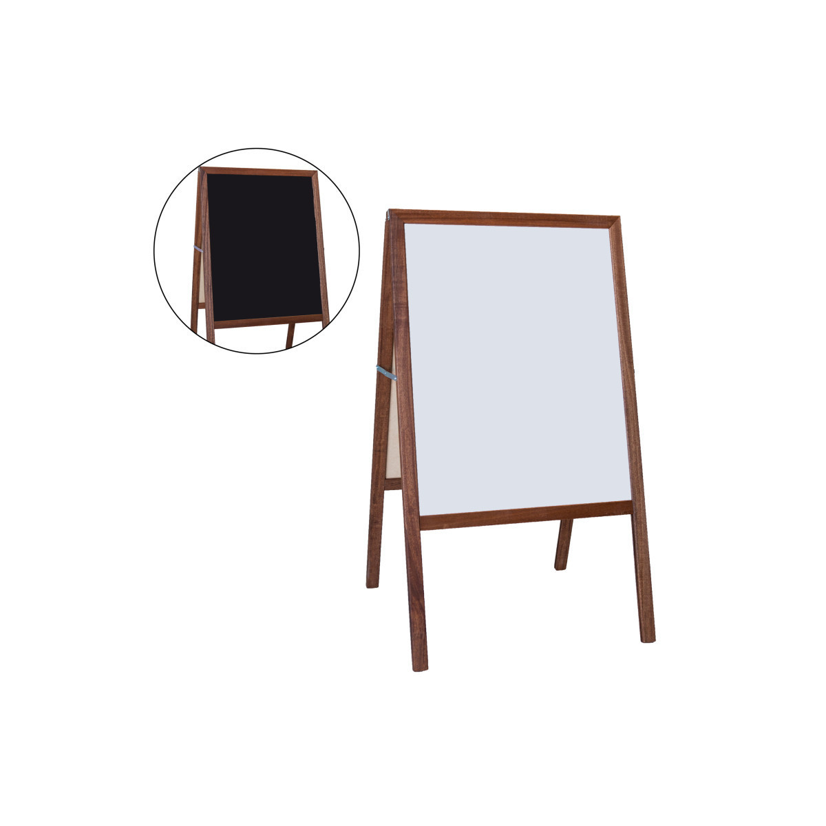 Signage Easels are ideal for announcements, sales & specials, menus, and much more! Easels fold flat for easy storage. The stained hardwood, two-sided easel features a black chalkboard on one side and a white dry-erase board on the opposite side. Measures 42" H X 24" W.