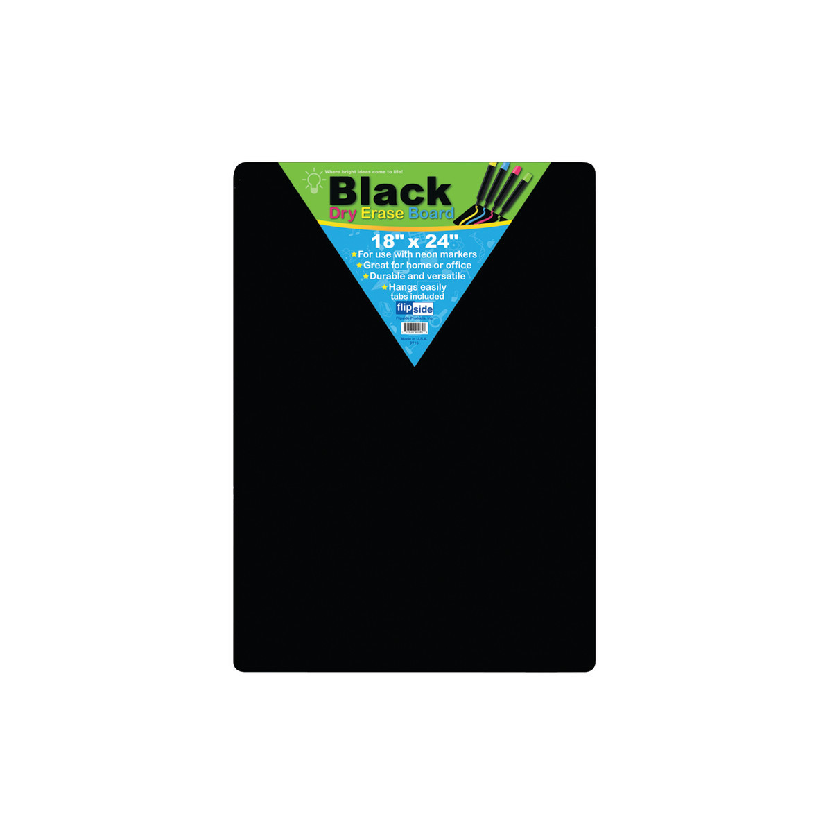 Use neon dry erase markers on this economical, unframed board with a plain black dry erase surface for doodling, academic lessons, agendas, and more! Quality write-and-wipe surface is non-ghosting. Hardboard backing is warp and chip resistant. Rounded corners and smooth edges for comfort and safety. Adhesive squares included for mounting. Measures 18" x 24" x 0.125".
