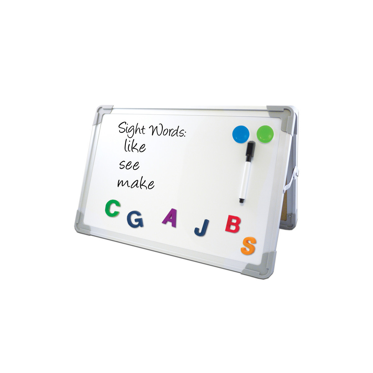 Ideal for small-group learning activities, this versatile double-sided easel brings interactivity to a child's fingertips! Features two magnetic dry erase surfaces, one dry erase pen with magnetic eraser cap, and two colorful disk magnets. Lightweight aluminum frame with rounded plastic corners for style and safety folds flat for easy storage. Overall closed dimensions are 18" wide x 12" high x 1.75" deep. Opens to 10.5" deep with locking hinges for stability and safety.