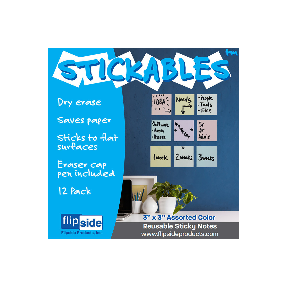 Stickables are high-quality, self-sticking reusable notes. One note can be reused thousands of times, making them the perfect replacement for paper notes, meanwhile reducing waste and saving paper. Made from premium PET whiteboard film and patented ez-cling technology. Stickables write smooth, are easy to clean, and resist ghosting. These reusable sticky notes are made of washable materials - just rinse and they become like new. Each pack contains 12 multi-color reusable sticky notes, a dry erase marker and measures 3" x 3".