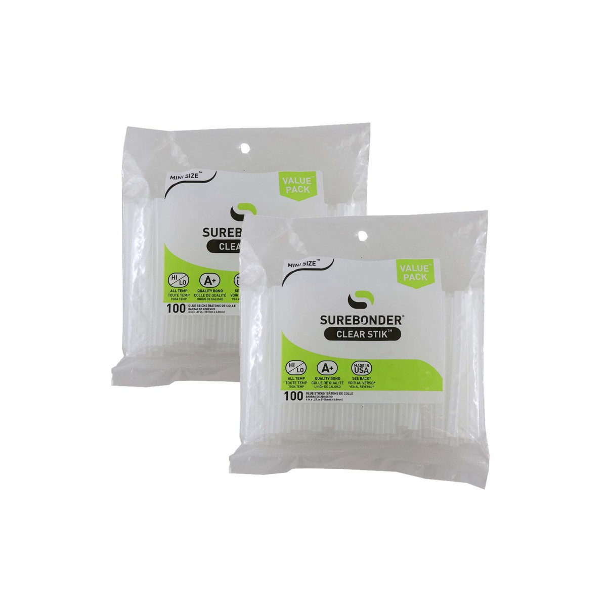Surebonder all-temperature mini hot melt adhesive works at either low temperature (230 degrees F) or high temperature (380 degrees F) for everyday gluing projects. Use with high or low temperature glue guns. Bonds to metal, wood, paper, fabric, magnets, ceramics, floral arrangements, glass and plastic using a high temperature glue gun. Bonds to delicate materials such as balloons, ribbon, lace and children's crafts using a low temperature glue gun. Clear color with 60-65 second working time. 5/16"diameter x 4" length. 100 sticks per bag. Sold as 2 bags for a total of 200 glue sticks.