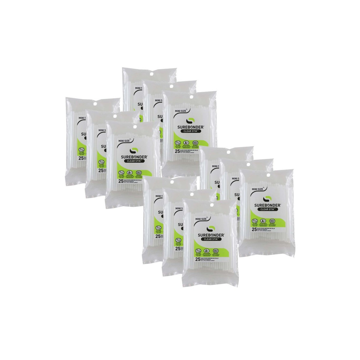 Surebonder DT-25 All Temperature Mini Glue Sticks is an all-temperature hot melt adhesive that works at either low temperature (230 degrees F) or high temperature (380 degrees F) for everyday gluing projects. Use with high or low temperature glue guns. Bonds to metal, wood, paper, fabric, magnets, ceramics, floral arrangements, glass and plastic using a high temperature glue gun. Bonds to delicate materials such as balloons, ribbon, lace and children's crafts using a low temperature glue gun. Clear color with 60-65 second working time. 5/16 -Inch diameter by 4-Inch length. 25 sticks per bag. Sold as 12 packs for a total of 300 glue sticks.