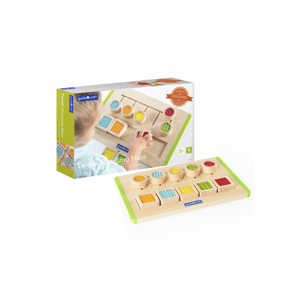 Little hands guide tactile circle pieces across the track to match the patterns of corresponding square blocks with Tactile Matching Maze. The five smooth-sanded circular pieces can be moved around the cutout path while remaining affixed to the sturdy puzzle board. Chunky square puzzle pieces with textured centers can be rearranged to create new patterns for toddlers to follow. With the Tactile Matching Maze toddlers can practice fine motor, problem solving and matching skills. Measures 15"W x 9.5"D x 2"H. Ages 3+