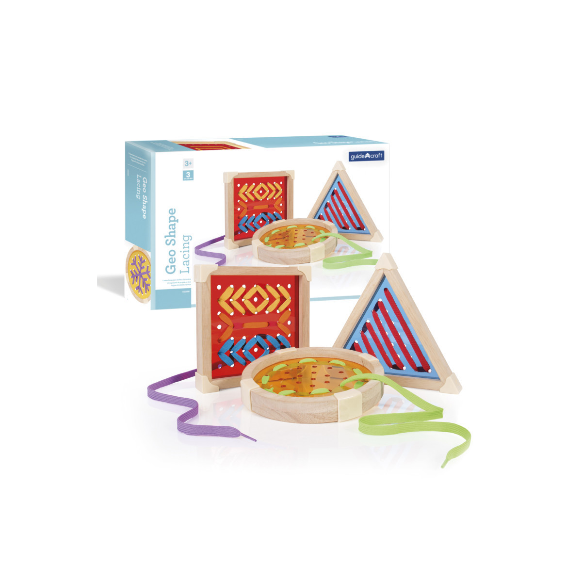 - Geo Shape Lacing is a colorful, geometric new look for a classic lacing activity toy