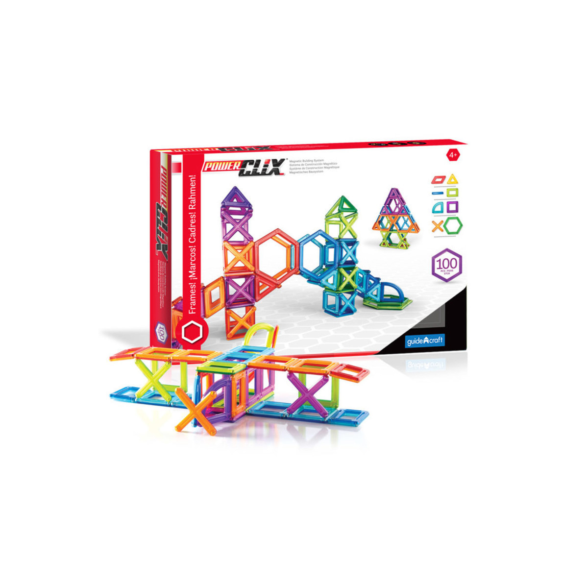 PowerClix® Frames have colorful, translucent plastics and geometric shapes that allow for open-ended, creativity-inspiring 2D and 3D constructions. Frames are for teaching and exploring wireframe geometry. A child may build unlimited 3D forms by visualizing the underlying design structure of an object, then creating a wireframe model of it using magnetic frames of geometric shapes. Frames are designed to integrate flawlessly with Solids and Organics, all part of the PowerClix® System. Ages 4+