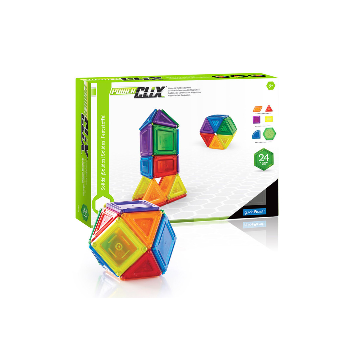 PowerClix® Solids have colorful, solid translucent plastics and geometric shapes that allow for open-ended, creativity-inspiring constructions. Solids are for teaching and exploring solid geometry. Created for the younger builder, both 2D and 3D forms may be built by distilling the structures down to simple solid geometric shapes, furthering their understanding of how mass and volume are used to model an object. Solids are designed to integrate flawlessly with Frames and Organics, all part of the PowerClix® System.