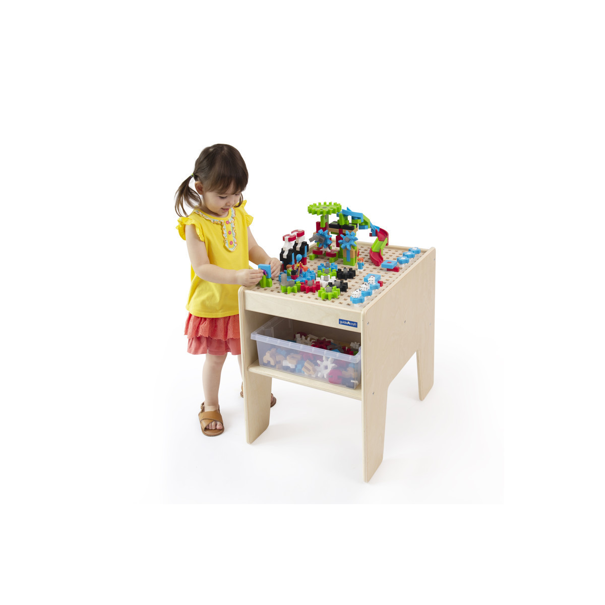 Children 3 and up will develop social emotional and STEM-based skills during hands-on, collaborative playtime around the IO Blocks STEM Table. This all-in-one set includes a durable, easy-to-clean birch table with raised grid tabletop for stabilized builds using the 200 gears, slides IO people and standard IO Blocks pieces. Keep pieces organized and accessible using the included 2 clear storage bins. Adult assembly required. Table measures 22" W x 16.5" D x 20" H (55cm W x 41cm D x 50cm H).