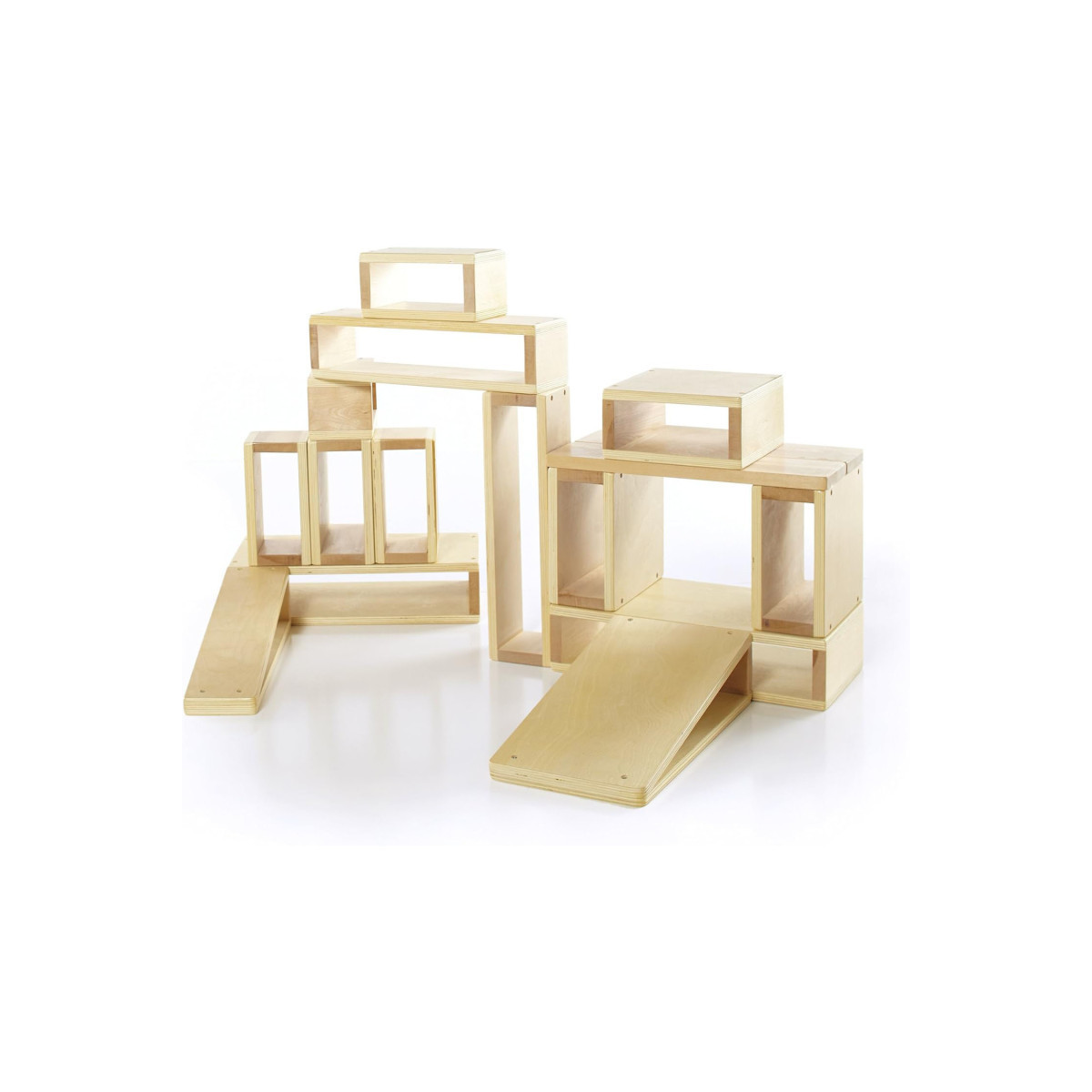 Oversized hollow blocks for giant creations! This 16-piece set is constructed of birch plywood and solids. Edges are rounded and surfaces are sanded smooth for safety and hours of creative play. Blocks are sealed and finished inside and out. For indoor use only. Largest block measures: 15.5"W x 8"D x 4"H. Smallest block measures: 4"W x 8"D x 4"H. Ages 3+.