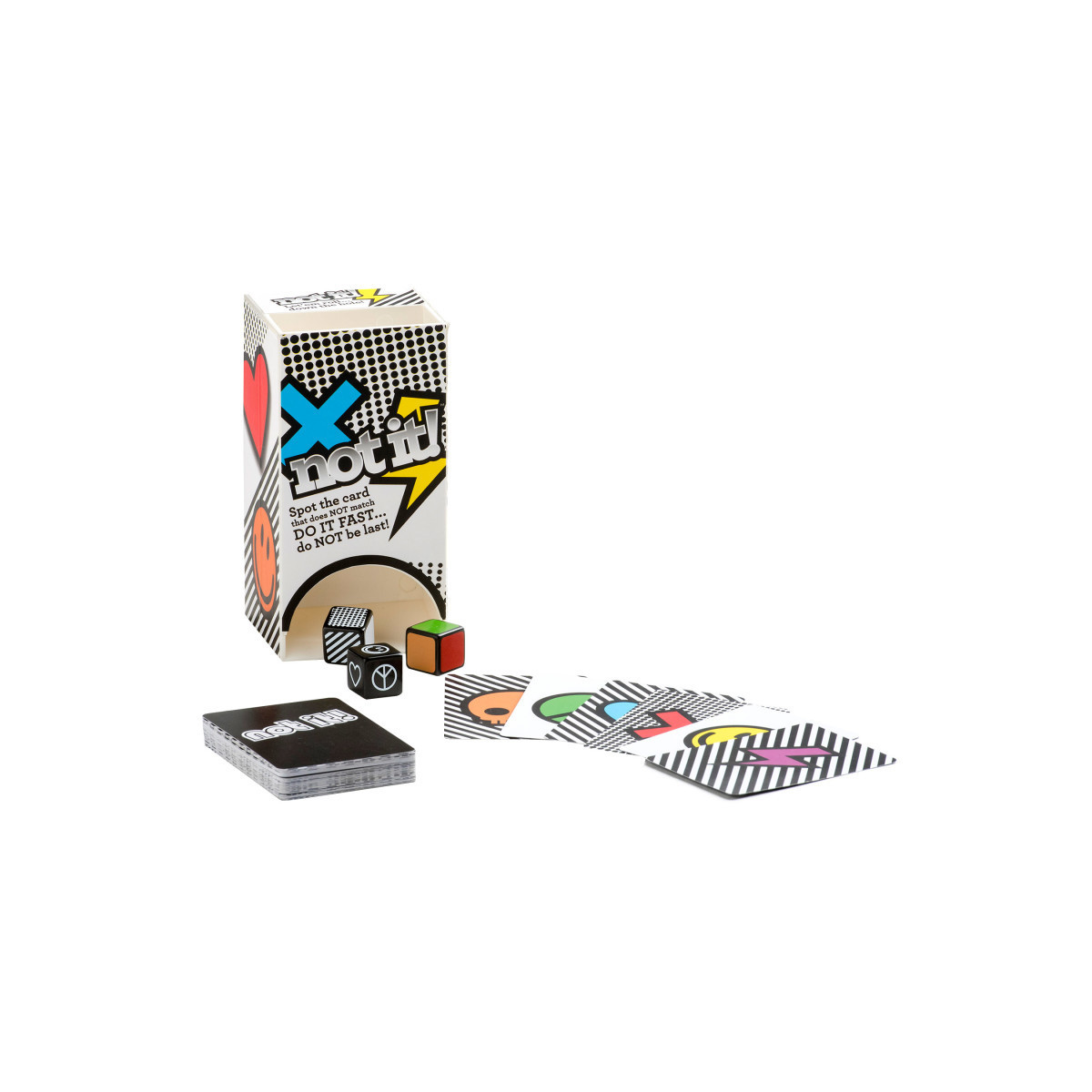 Spot the card that does NOT match! Do it fast... Do NOT be last! Can you find a card in your hand that does not match any of the attributes revealed on the 3 dice that tumble from the dice tower and onto the table? Find it as quickly as you can and slam it on the table and yell, "NOT IT!"